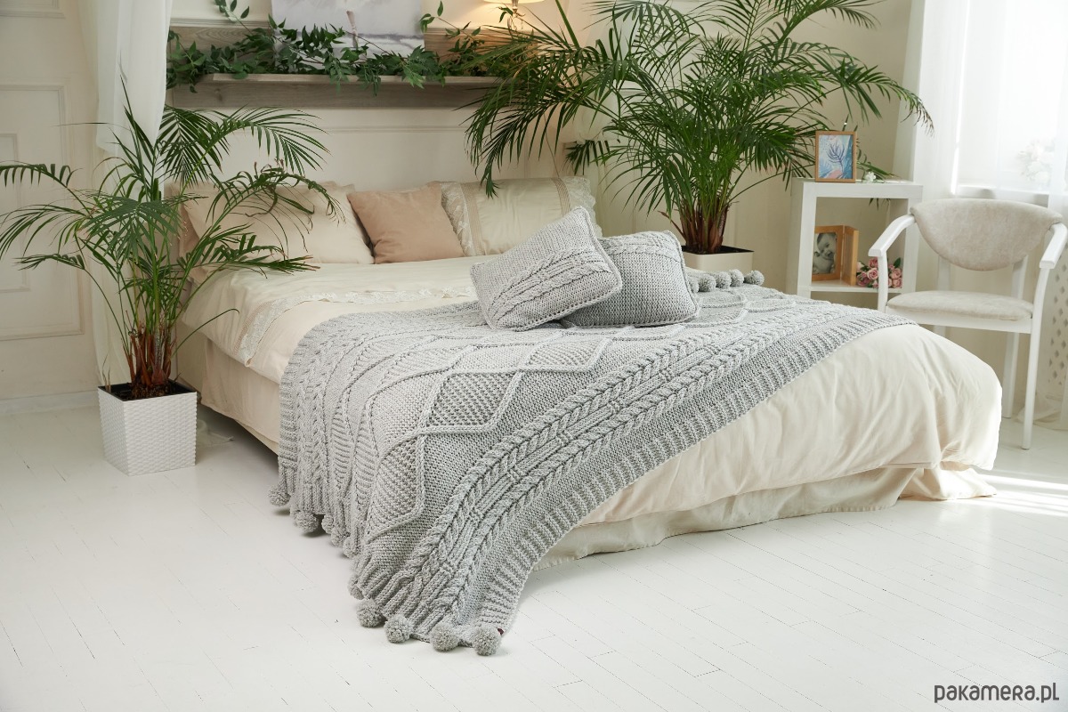 Bardzo piękny dzianinowy koc w jasnoszarym kolorze będzie ozdobą wnętrza Twojej sypialni lub salonu!