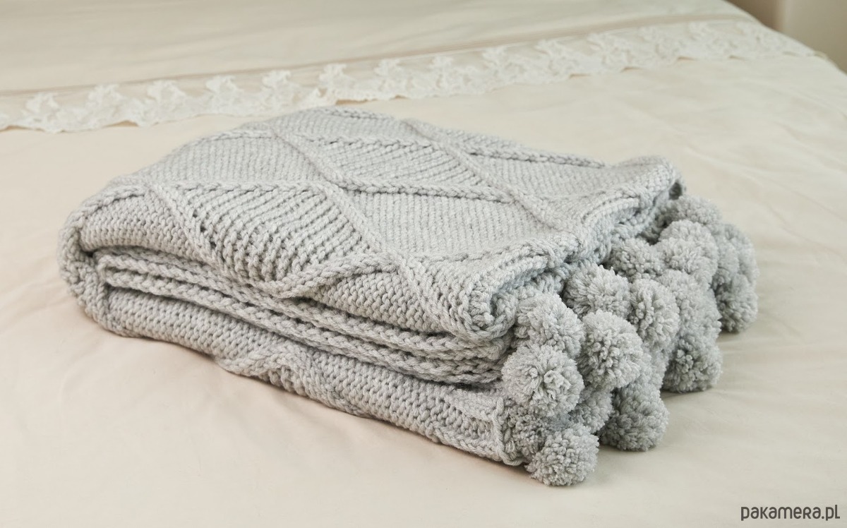 Dzianinowy pled z pomponami 130x195cm. Wykonany ręcznie