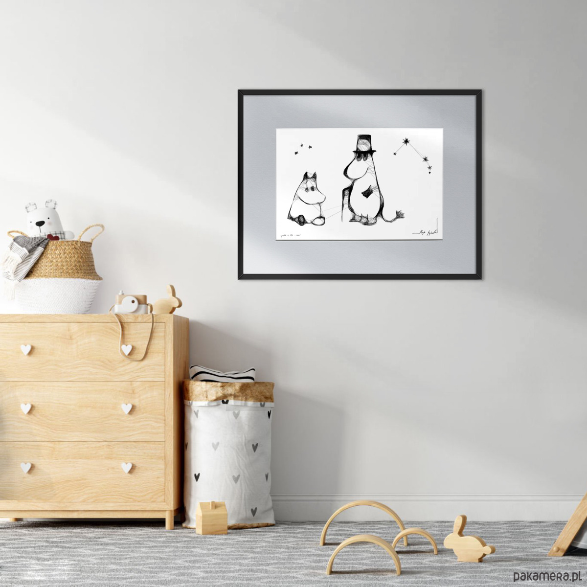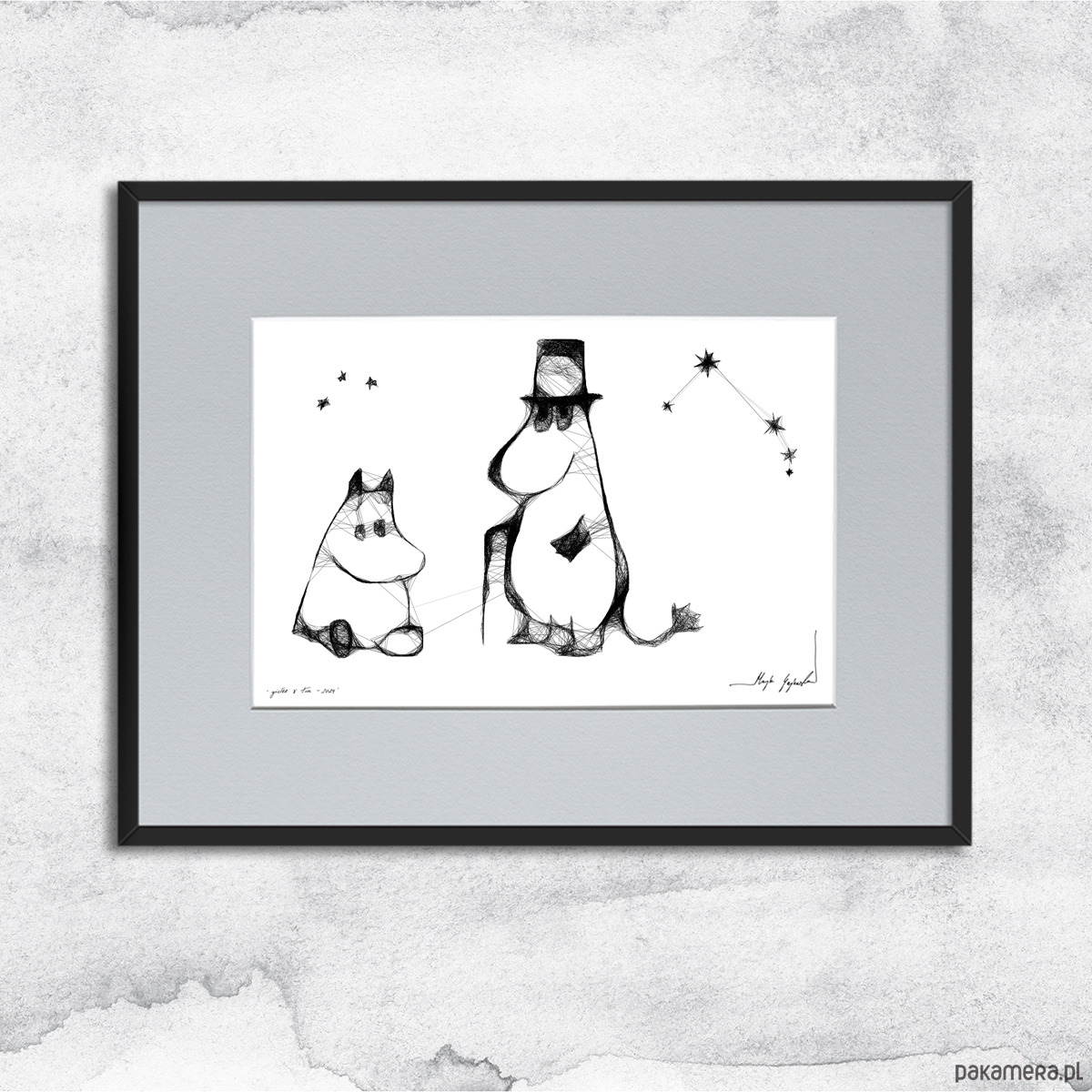 Grafika artystyczna została wykonana techniką mieszaną (giclée + rysunek isografem) na białym, matowym, o lekko fakturowanej powierzchni graficznym papierze Canson 250g. Grafiki dla dzieci nie muszą być kolorowe, aby urzekać i pasować do wnętrza. Minimalistyczne grafiki będą z całą pewnością oryginalnym akcentem dekoratorskim do pokoju dziecka. Czarno-biała grafika nr 23 należy do cyklu prac zainspirowanych bajką "Muminki".