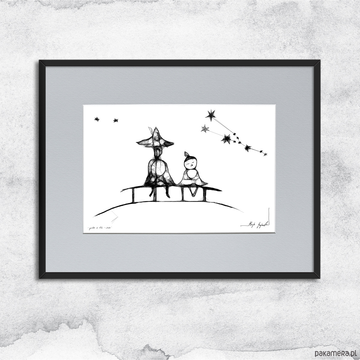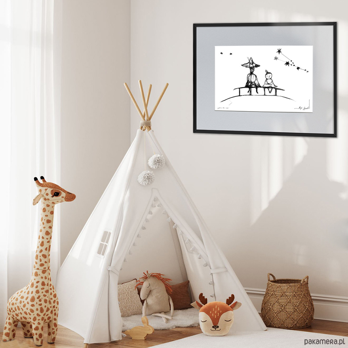 Grafika artystyczna została wykonana techniką mieszaną (giclée + rysunek isografem) na białym, matowym, o lekko fakturowanej powierzchni graficznym papierze Canson 250g. Grafiki dla dzieci nie muszą być kolorowe, aby urzekać i pasować do wnętrza. Minimalistyczne grafiki będą z całą pewnością oryginalnym akcentem dekoratorskim do pokoju dziecka. Czarno-biała grafika nr 23 należy do cyklu prac zainspirowanych bajką "Muminki".