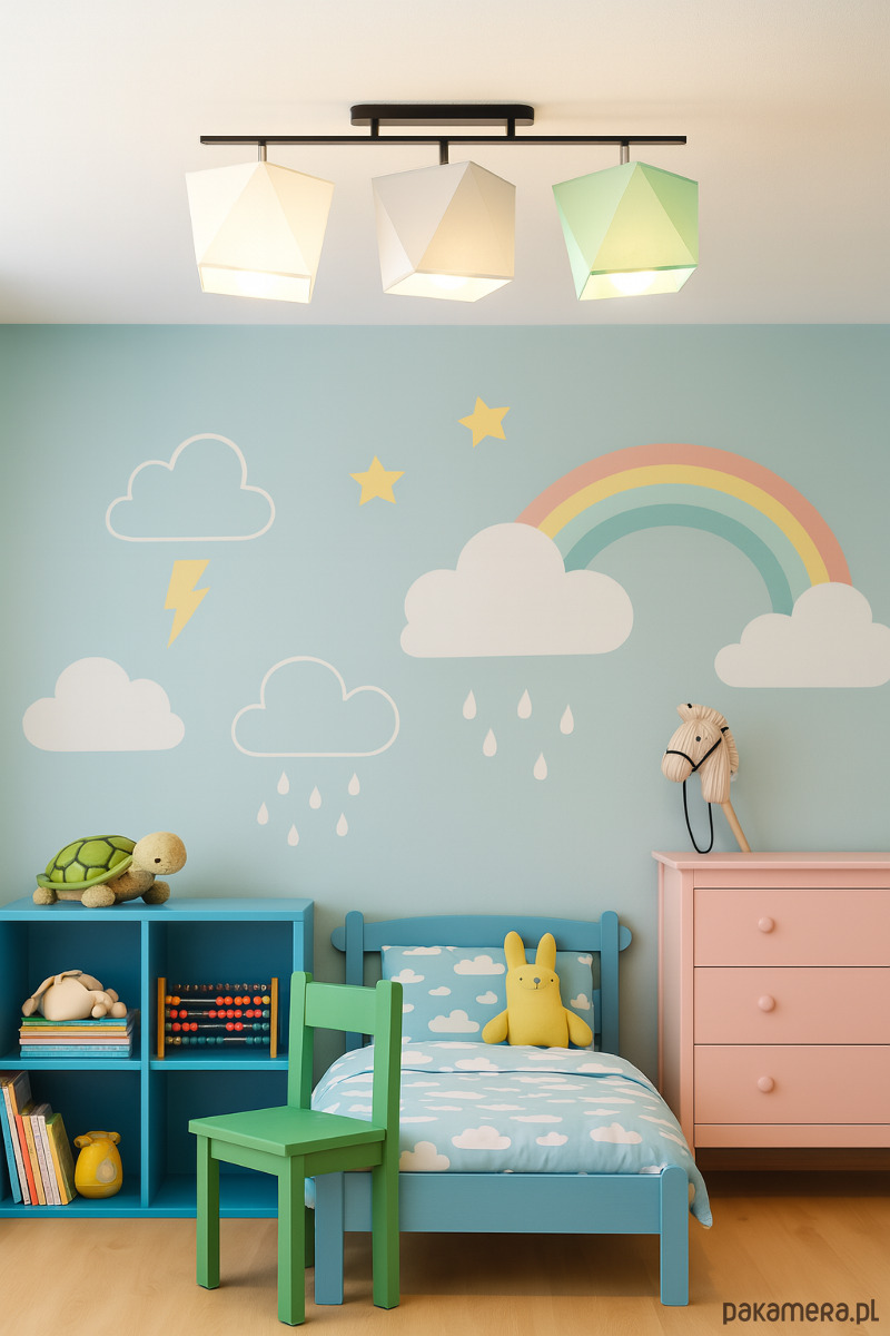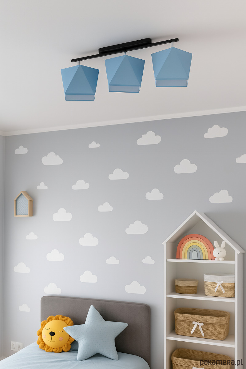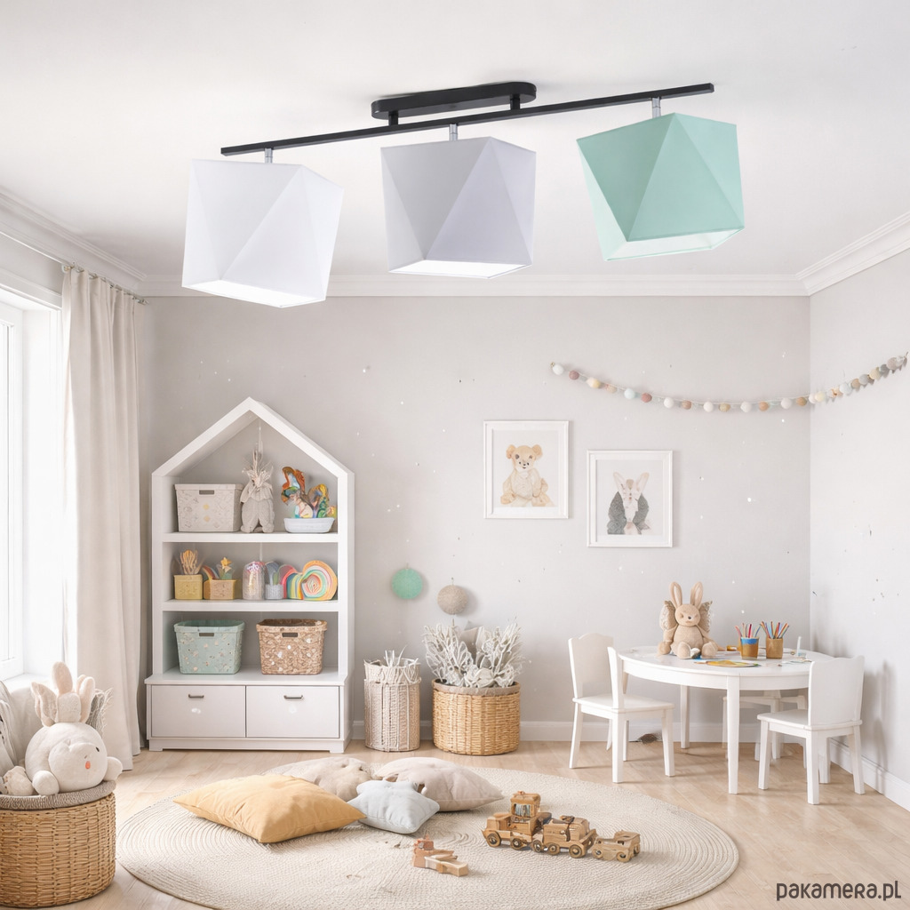Plafoniera DETROIT to nasza odpowiedź na potrzeby najmłodszych klientów. Stylowa i funkcjonalna. Smukła, prosta linia stelaża idealnie współgra z równo rozmieszczonymi geometrycznymi abażurami kształtem przypominającym diamenty. Lampa sufitowa DETROIT będzie dopełnieniem aranżacji pokoju Twojej pociechy. Ze względu na indywidualny dobór kolorystyki abażurów (można wybrać 3 różne kolory) i stelaży DETROIT staje się lampą niezwykle uniwersalną. Plafon posiada regulację kąta padania światła dzięki ruchomym przegubom przy abażurach.