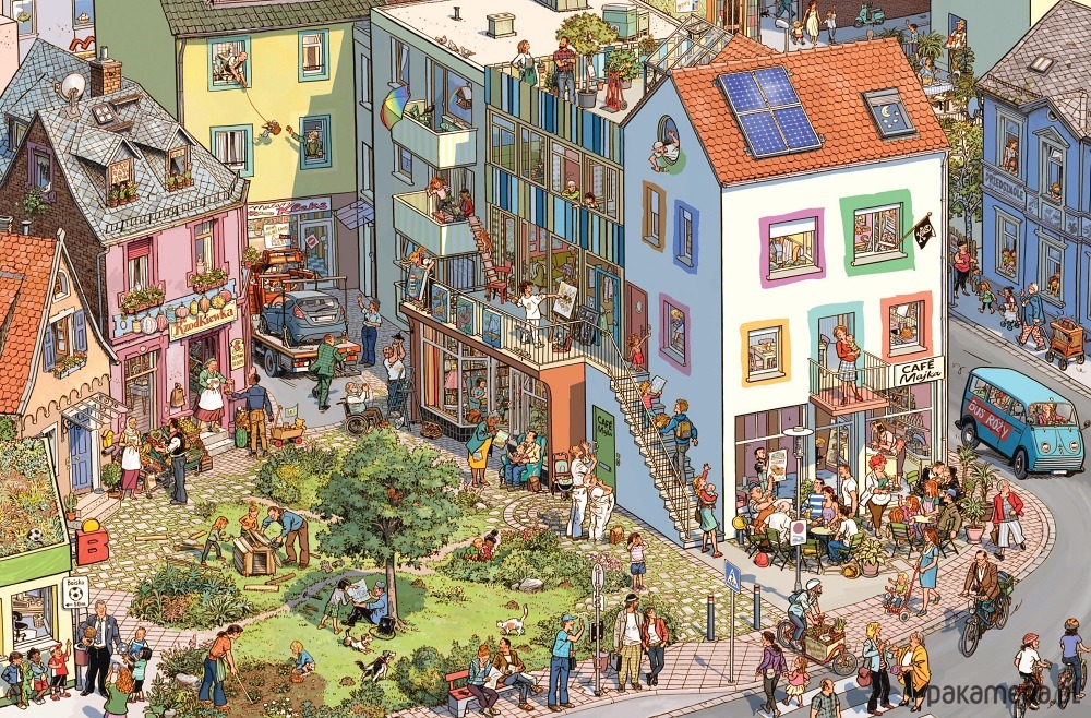 Nie martwcie się, że nie potraficie wymyślać historyjek. One już tu są, trzeba je tylko opowiedzieć. Na tylnej okładce znajdziecie wymienione wszystkie postaci i ich imiona. Potem możecie szukać ich na każdej ze stron, sprawdzać, co robią i wspólnie opowiadać ich przygody.