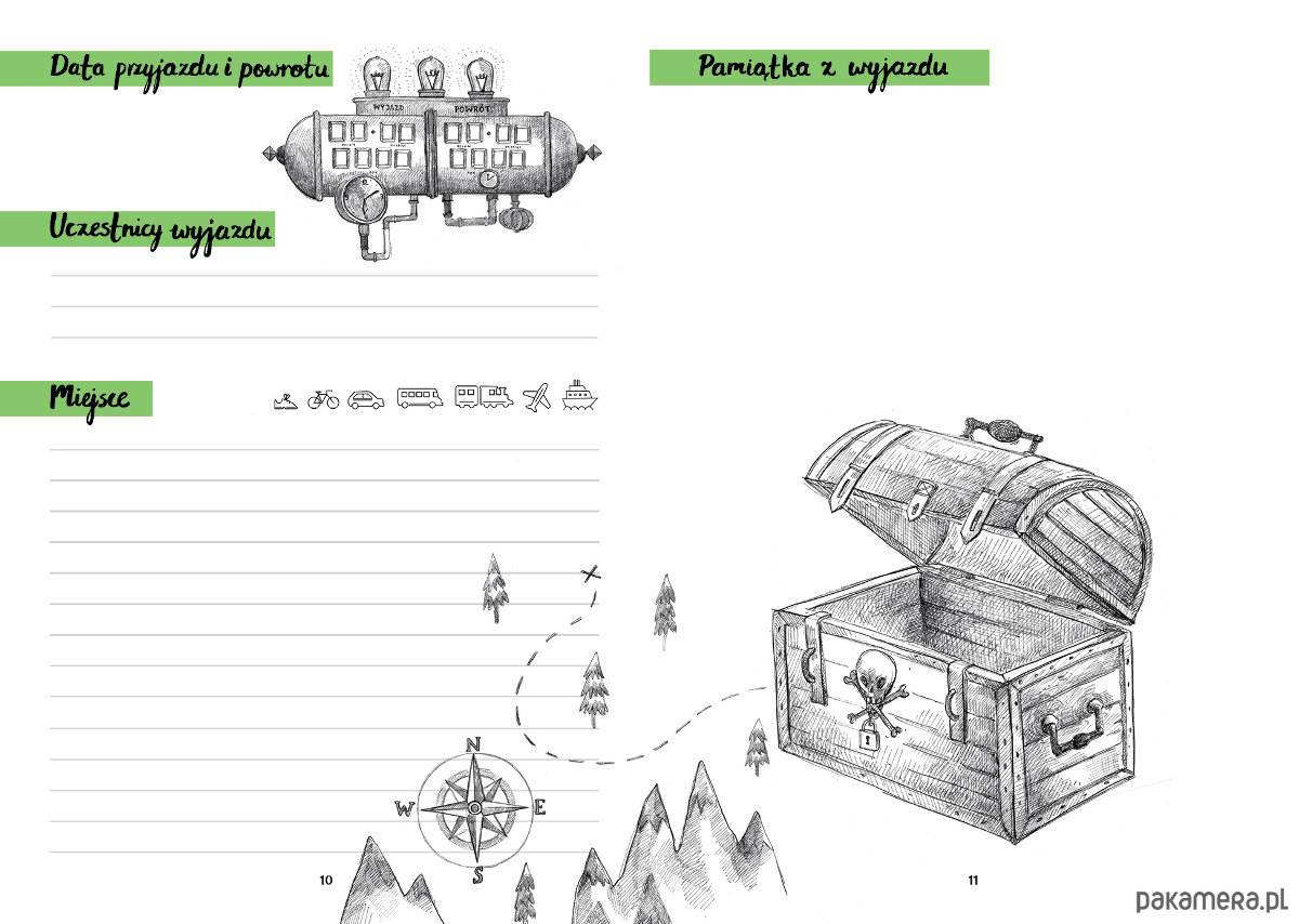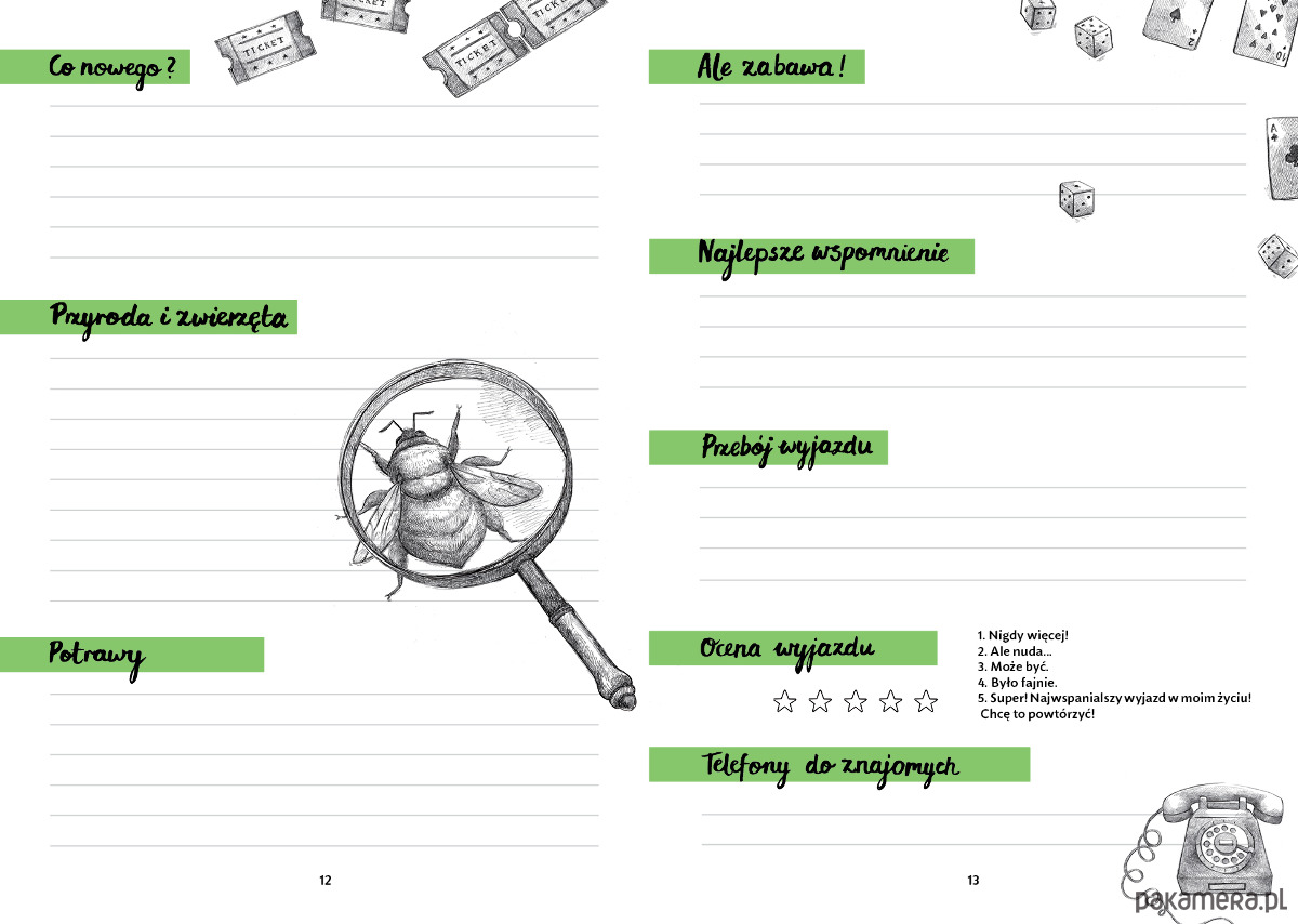W poszczególnych polach dzieci uzupełnią daty wyjazdu i imiona uczestników. Opiszą miejsce wyjazdu i czego się nauczyły się. Warto, aby zanotowały zasady nowopoznanej gry, by móc się w nią pobawić również podczas kolejnej wyprawy a także zapisały najlepsze powiedzenia i dowcipy, które wszystkich śmieszyły.