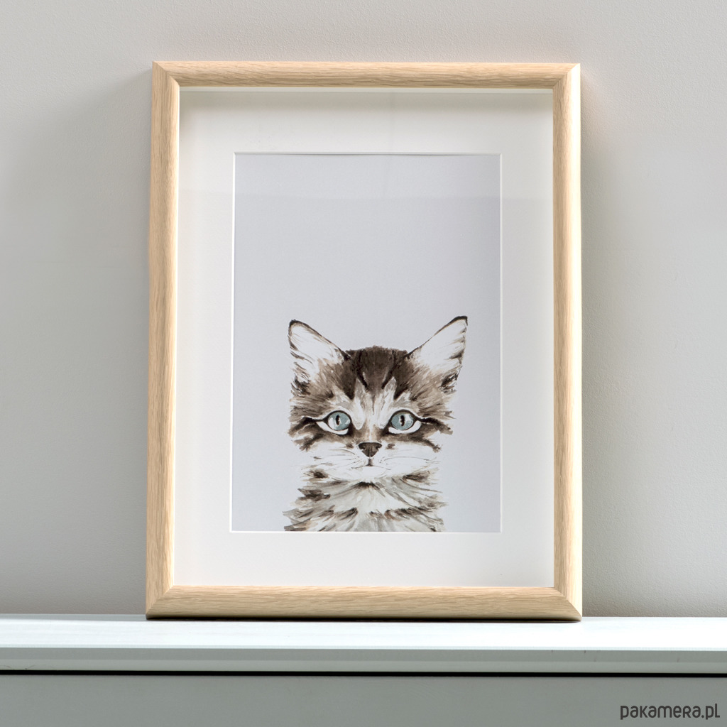 Portret małego kotka to autorska ilustracja z serii "Bimbla's Little Friends". Obrazek został namalowany ręcznie, a następnie wydrukowany na wysokiej jakości papierze kredowym o gramaturze 350g. Sprzedawany jest bez ramki.