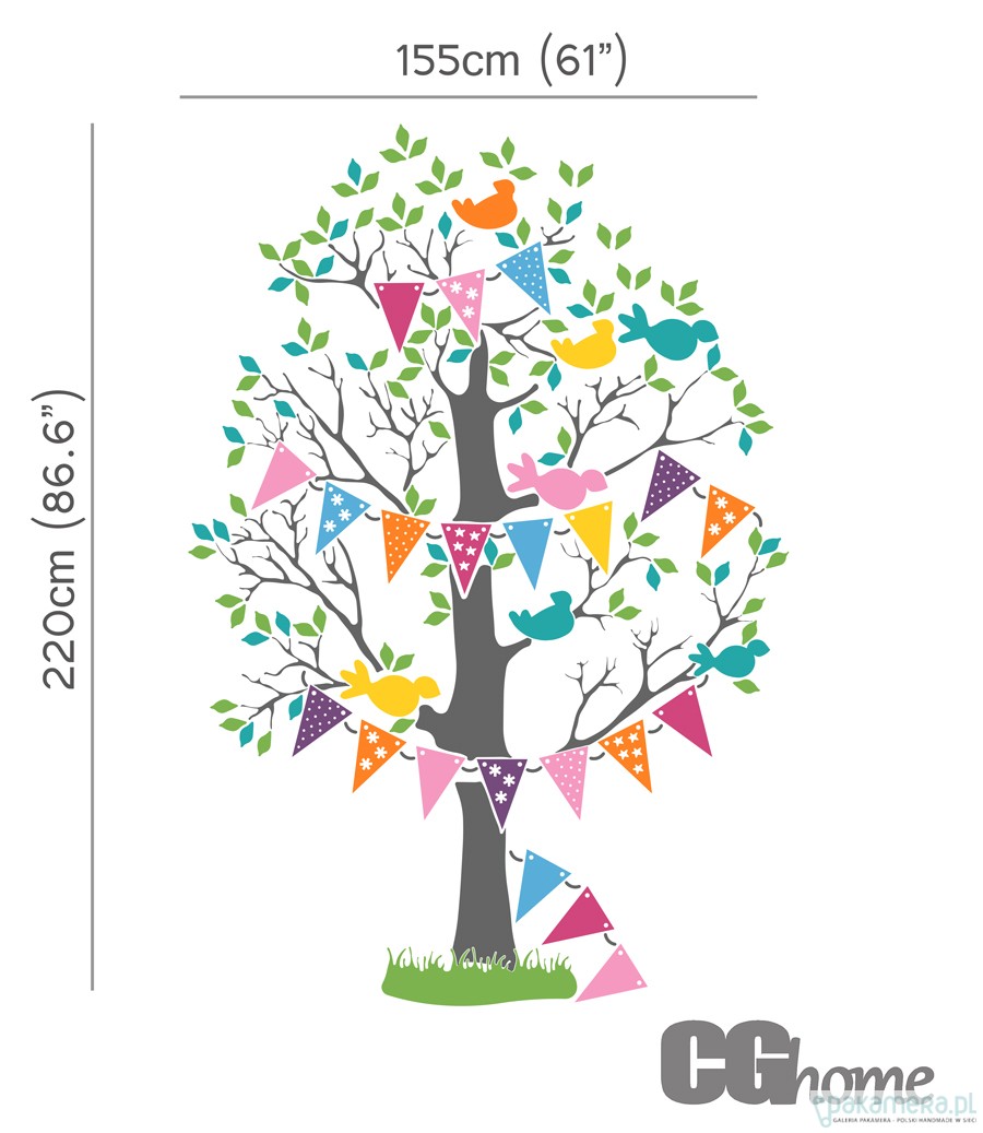 Olbrzymie drzewo wypełni cały pokój Twojego dziecka. Pomoże Ci odpowiadać na pierwsze pytania dziecka - co to jest, gdzie są liście, gdzie jest ptaszek, co to za kolor, pobudzi jego kreatywność i ciekawość świata, a dla starszego dziecka będzie inspiracją do tworzenia pierwszych rysunków, wymyślania zabaw. Kolorowe drzewo będzie głównym akcentem pokoju,a wysokiej jakości folia MATOWA, łatwa w aplikacji i czyszczeniu, pozwoli, aby wytrwało do nastoletniego wieku w niezmienionej formie.:-) WIELKOŚĆ: 220cm wysokości x 155cm szerokości KOLOR: Wykonane w 9 kolorach z karty kolorów CGhome. Naklejka wysyłana na folii transferowej z prostą instrukcją montażu. CGhome to projektanci i producent naklejek (możemy wykonać naklejki w innym rozmiarze lub dowolnym kolorze z karty kolorów CGhome). Wystarczy że napiszesz!:-) Już wkrótce nowe drzewa w różnej kolorystyce.