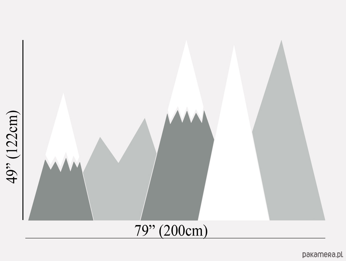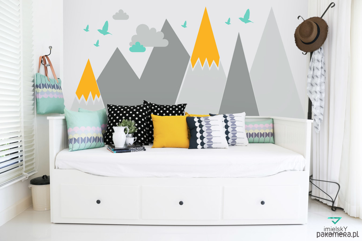 WIELKOŚĆ: GÓRY ok 122cm wysokości x 200cm szerokości (przyklej w dowolnej konfiguracji na jednej lub dwóch ścianach, na kilku wysokościach) + ptaki + chmurki