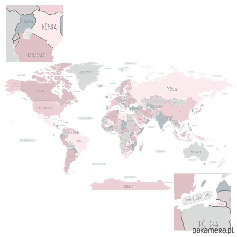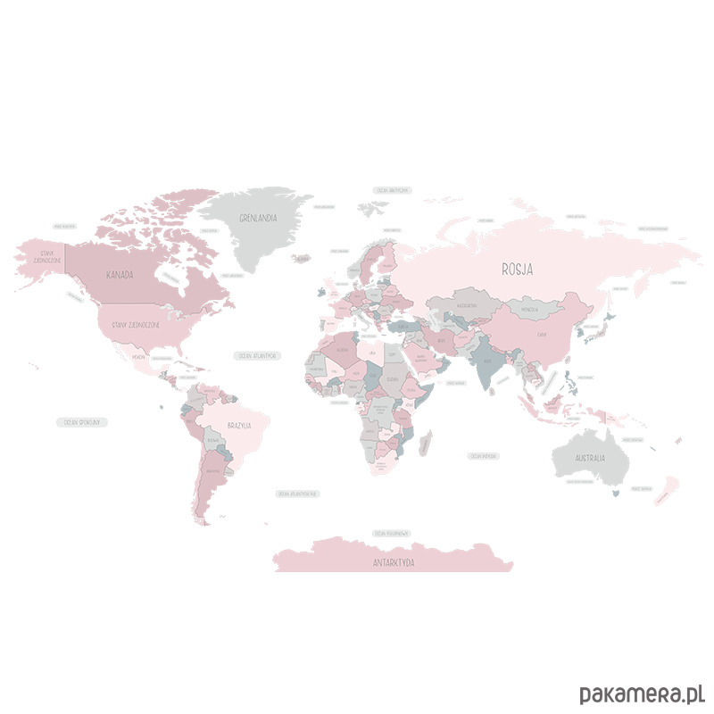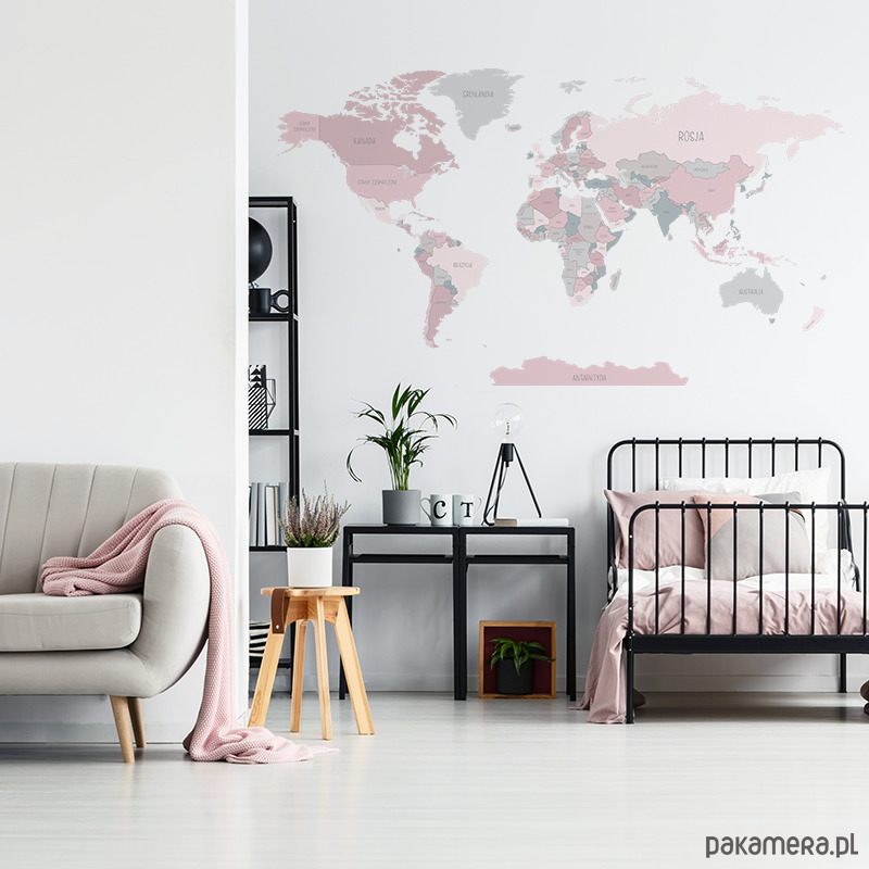 Naklejka na ścianę wycinana z folii matowej. Mapa świata z podziałem na państwa oraz wybrane zbiorniki wodne.