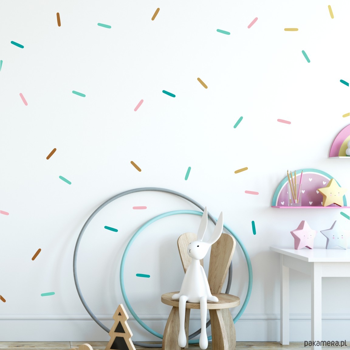 Rozwesel ściany w pokoiku Twojego dziecka, dzięki naszym naklejkom w kształcie kolorowych cukiereczków - posypki.