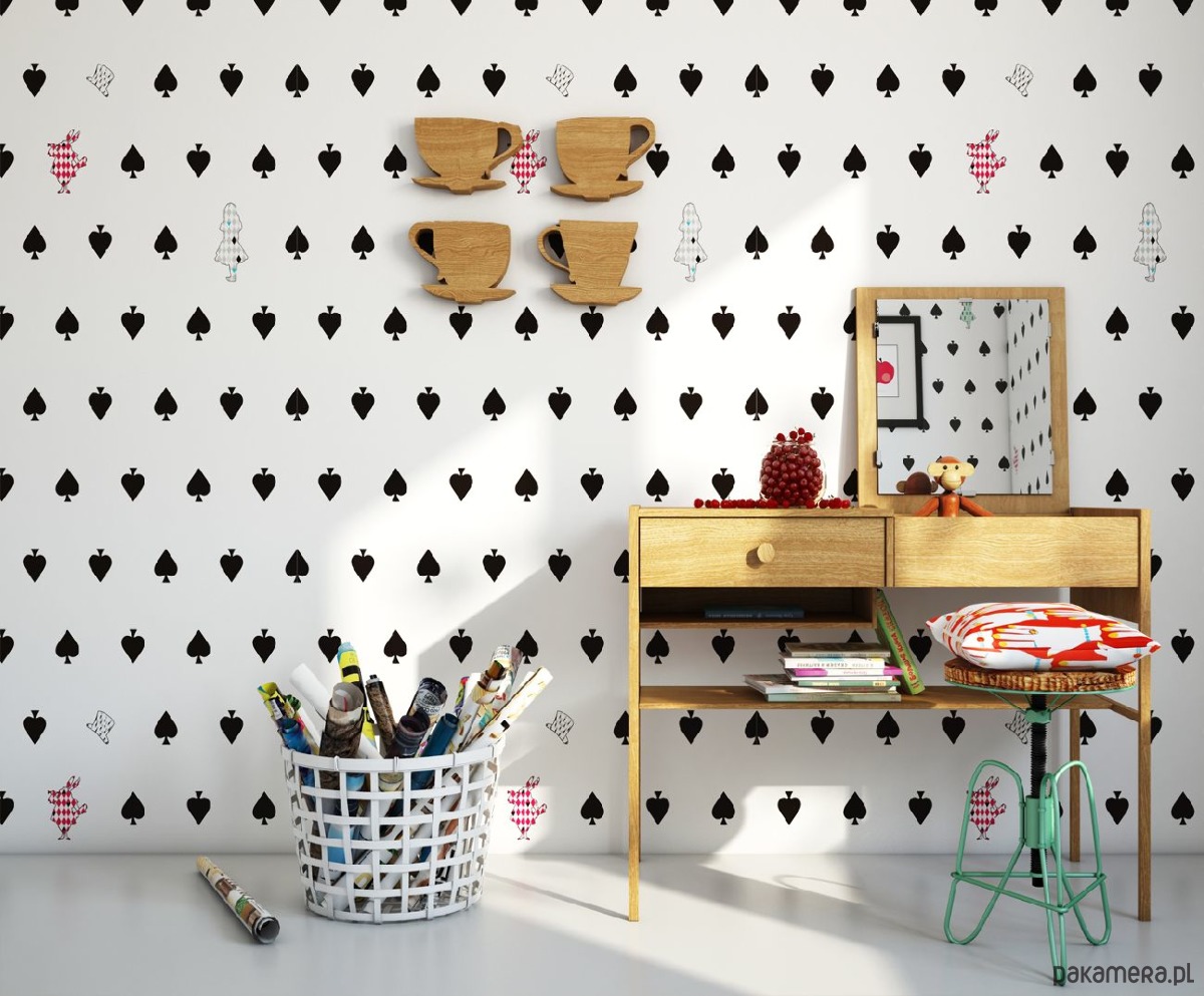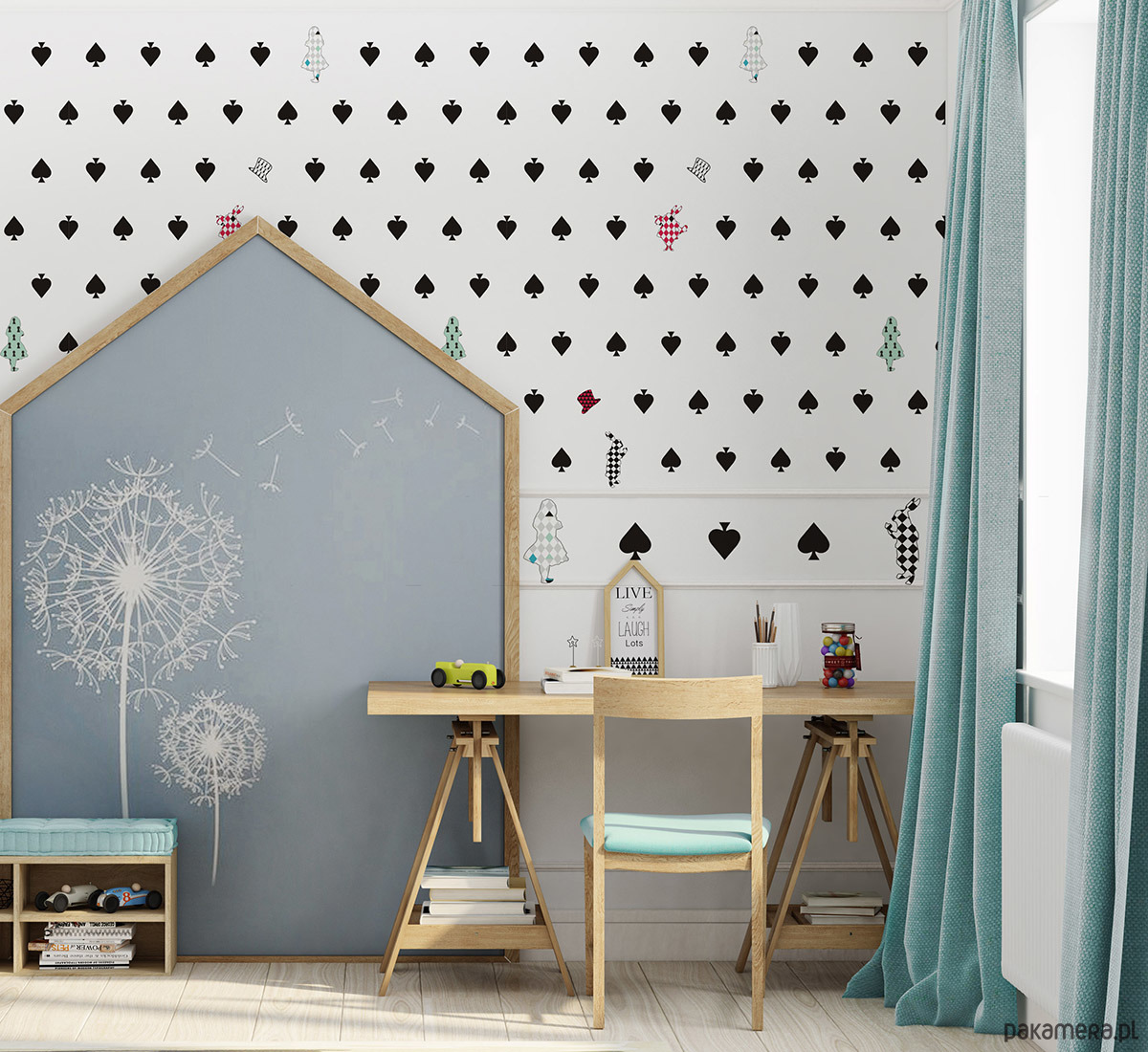 Tapeta dziecięca Alice in Wonderland II to produkt, który pomaga stworzyć wyjątkową magiczną przestrzeń dla dziecka w każdym wieku. To idealne rozwiązanie dla miłośników oryginalnych, minimalistycznych i nowoczesnych wnętrz. Elementy wzoru zawierają czarne piki, a cienie głównych bohaterów bajki są wtopione w geometryczne kolorowe struktury. Tapeta posiada białe tło.