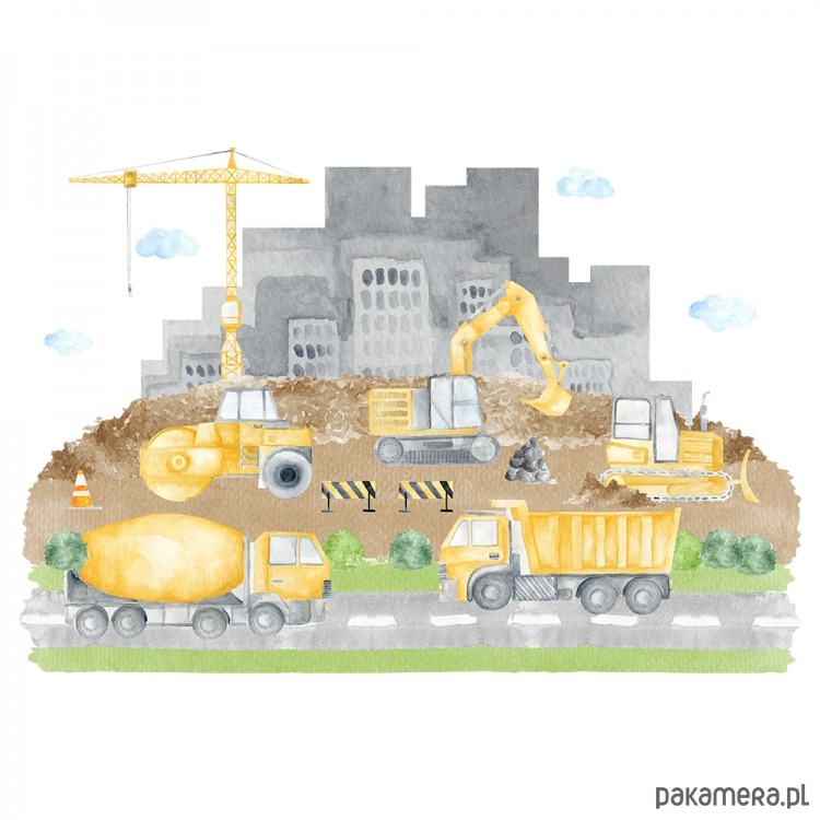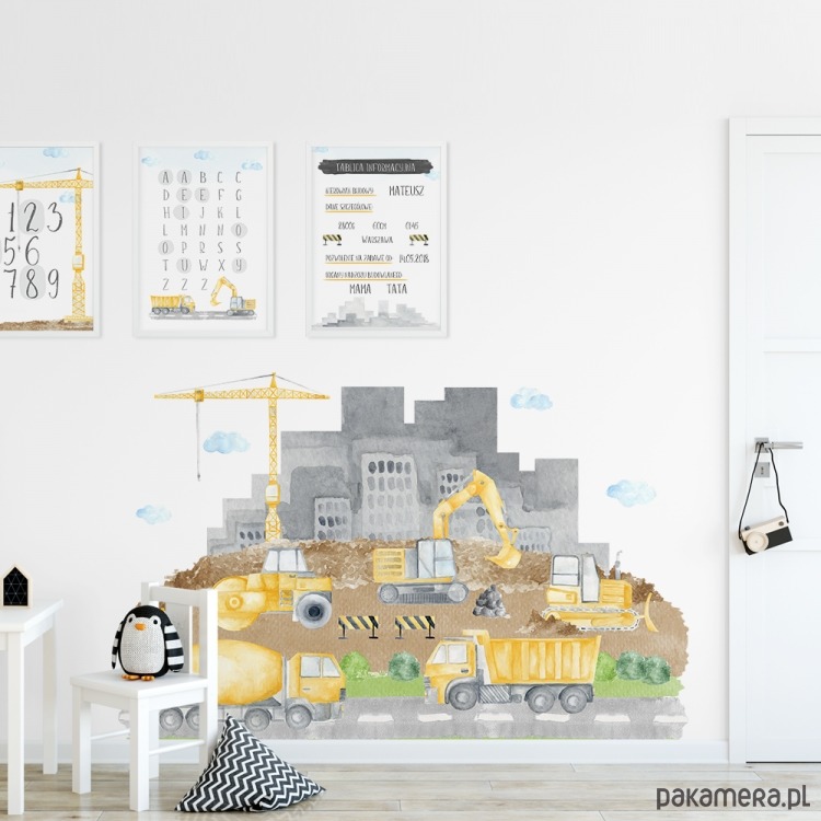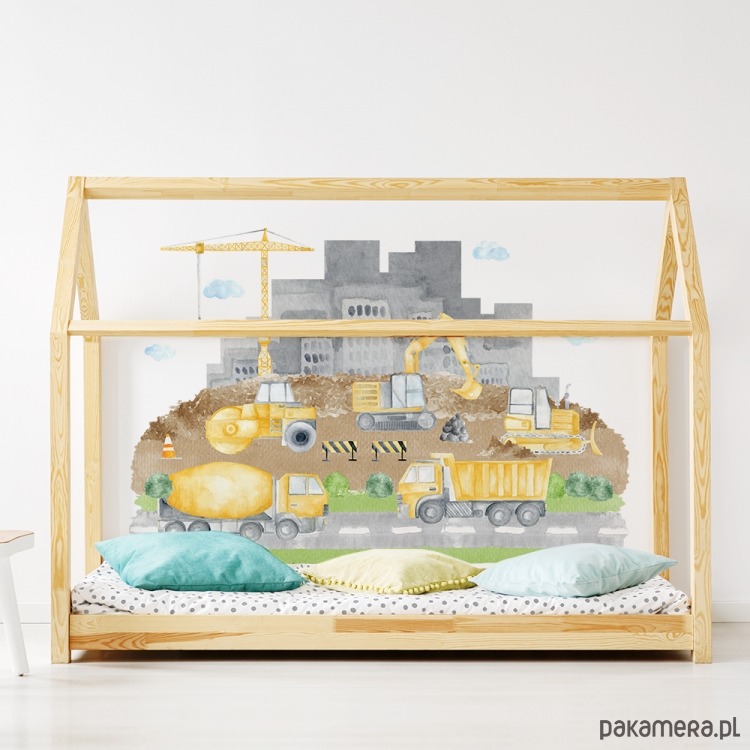 Drukowana naklejka na ścianę do pokoju dziecięcego wycinana z folii matowej, pokryta laminatem, przypadnie do gustu każdemu małemu budowniczemu.