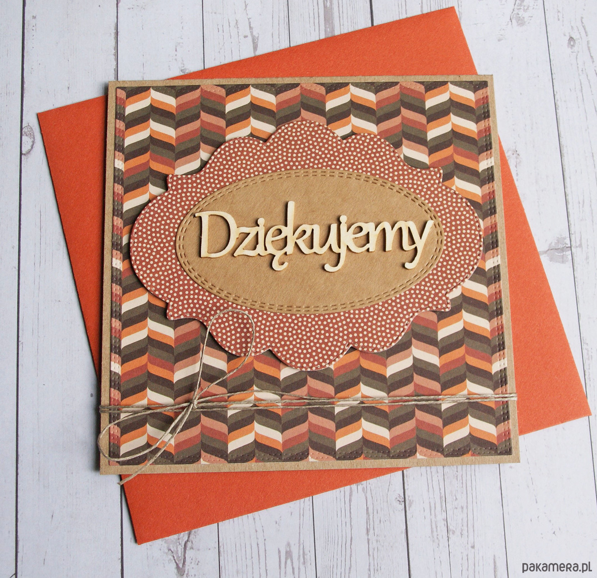 wykonana na bazie bardzo grubego papieru eko-kraft (100% makulatury). ozdobiona kolorowymi, wzorzystymi kartonami; w centrum przestrzenny element z napisem DZIĘKUJEMY (z beermaty). przewiązana naturalnym sznureczkiem.