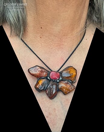 Bursztynowy kwiat z koralem UNIKATOWY wisior ręcznie robiony PREZENT