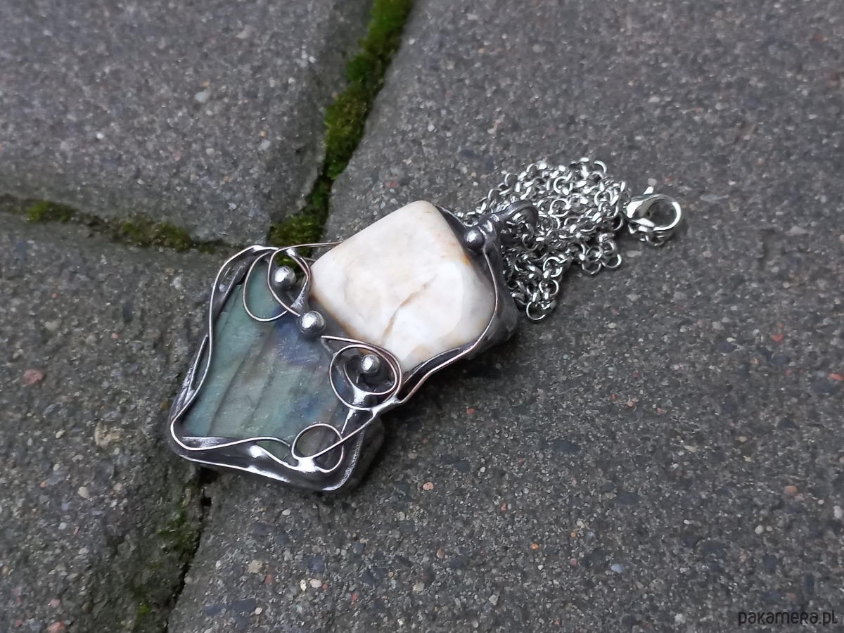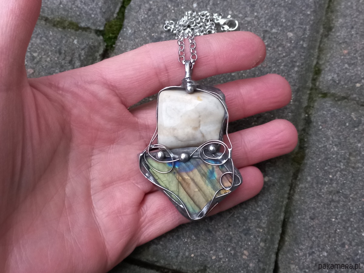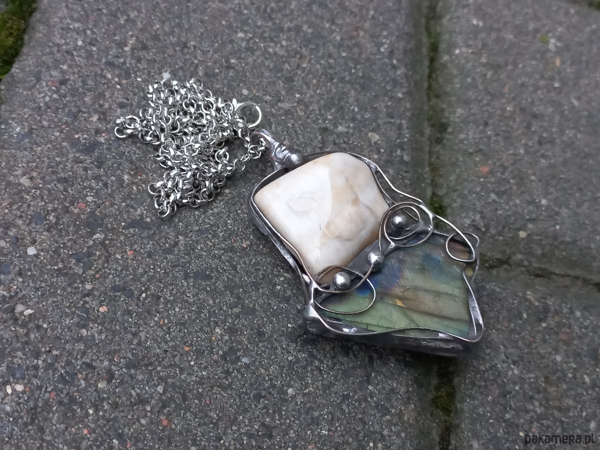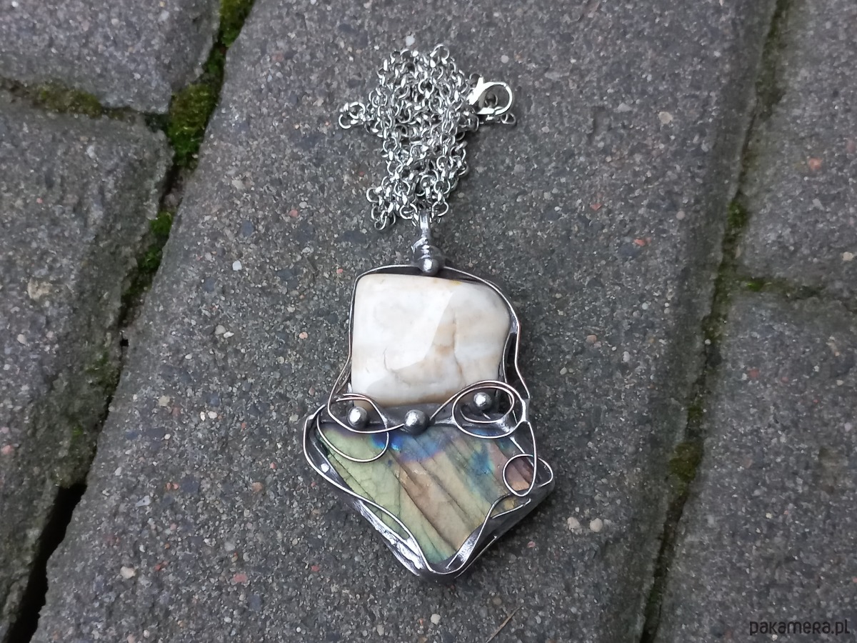 Wisiorek wykonany z miedzi, cyny, labradorytu i jaspisu. Wymiary ok. 5,5 na 4 cm. Zawieszony na łańcuszku o długości ok. 50 cm.