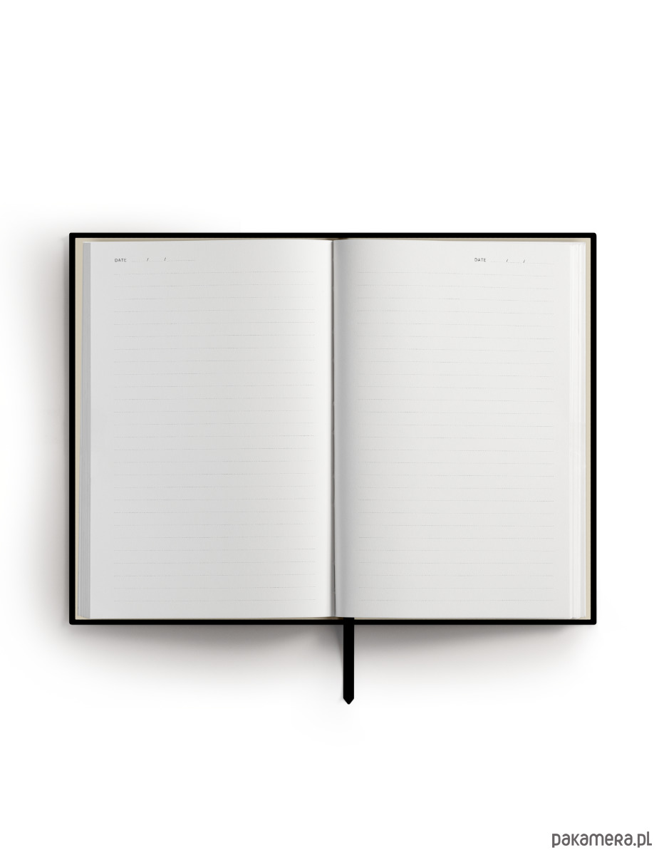 Wewnątrz: Strony w linie z miejscem na wpisanie daty; jedna zakładka z tasiemki