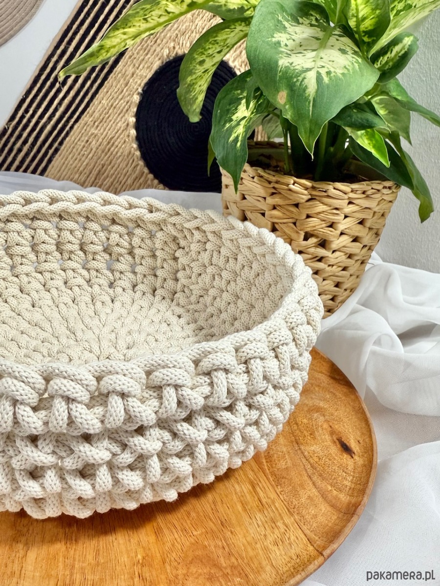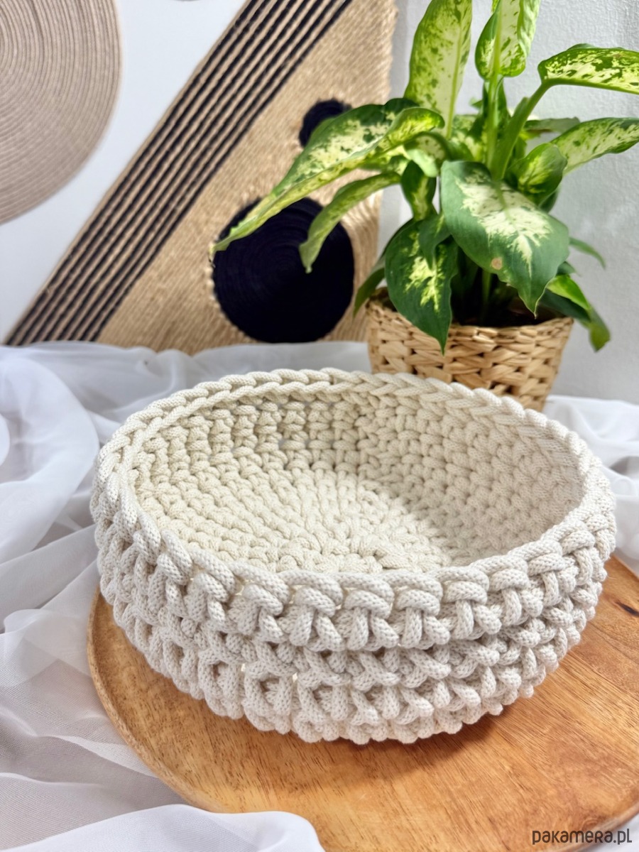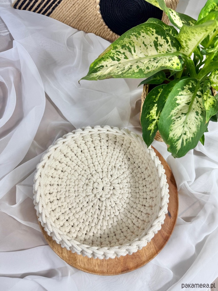 Ten ręcznie dziergany koszyczek ze sznurka bawełnianego w eleganckim naturalnym odcieniu idealnie wpasuje się w każde wnętrze. Jest praktyczny a jednocześnie stylowy – świetny na drobiazgi, kosmetyki czy akcesoria.