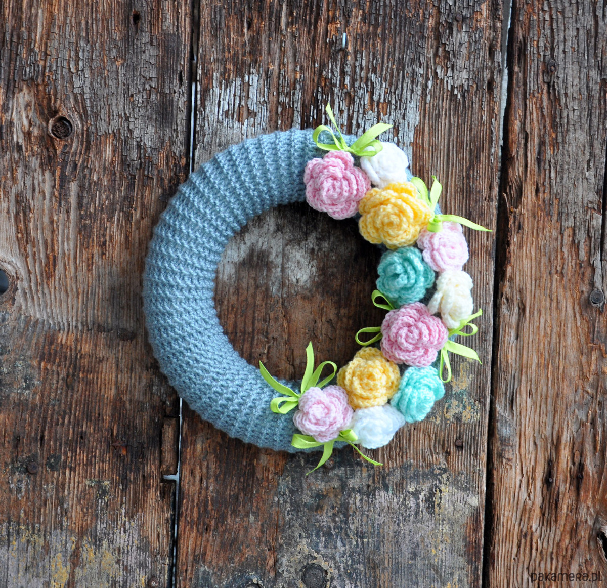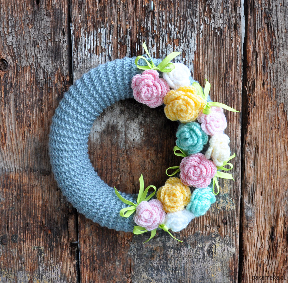 Piękny i wyjątkowy wianek w szarym sweterku ozdobiony szydełkowymi różami w pastelowych kolorach oraz wstążką; średnica ok.30cm; wianek przystosowany do powieszenia na drzwiach, ścianie lub w oknie; wianki występują w pojedynczych egzemplarzach, nie ma możliwości powtórzenia wzoru; zapraszam serdecznie