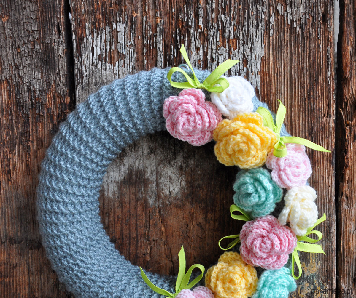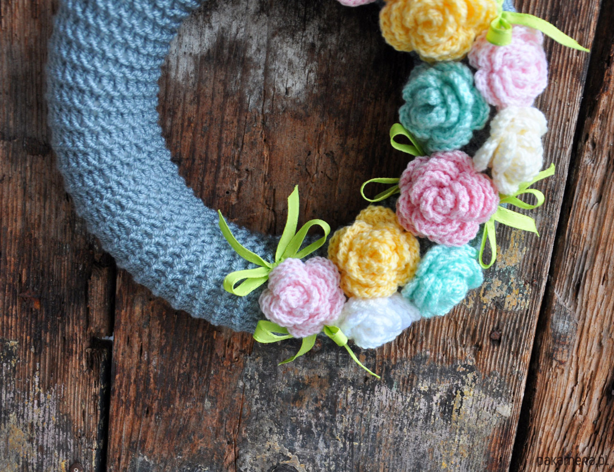 Dziergany wianek w sweterku z różami