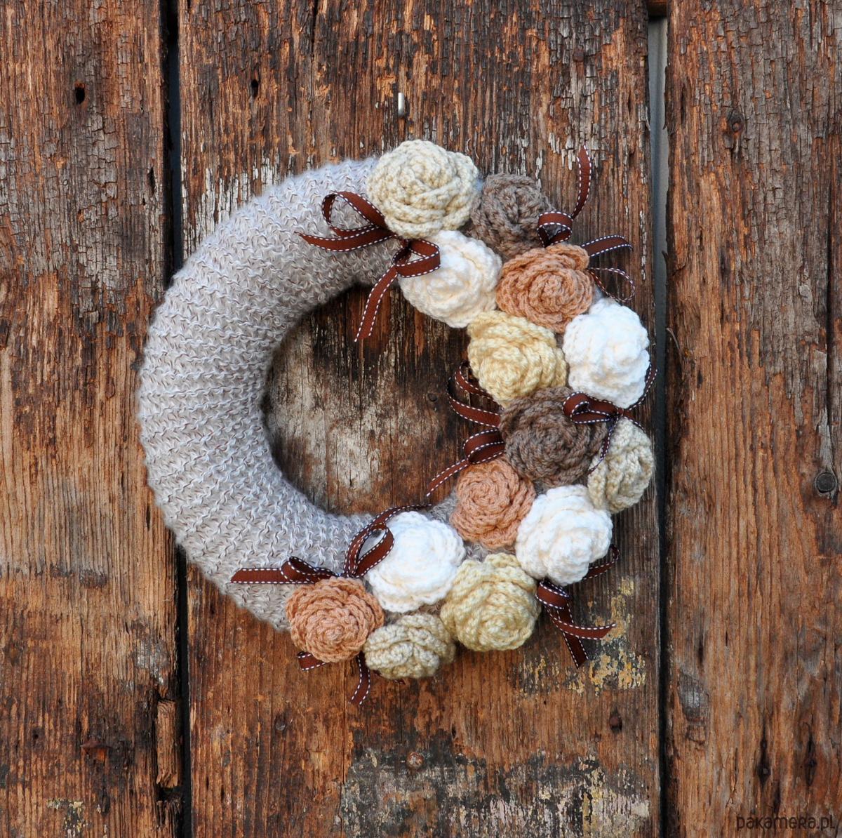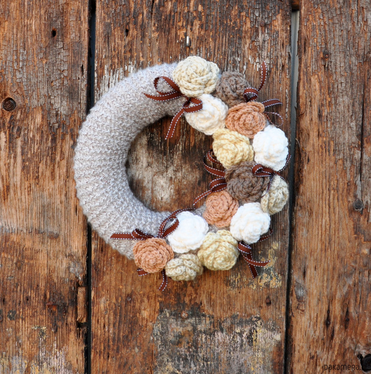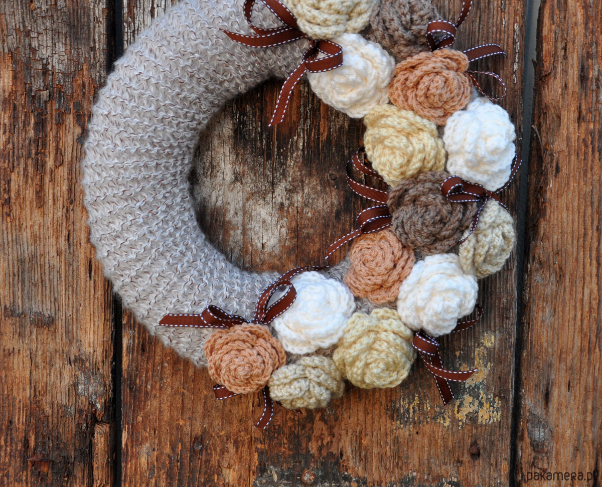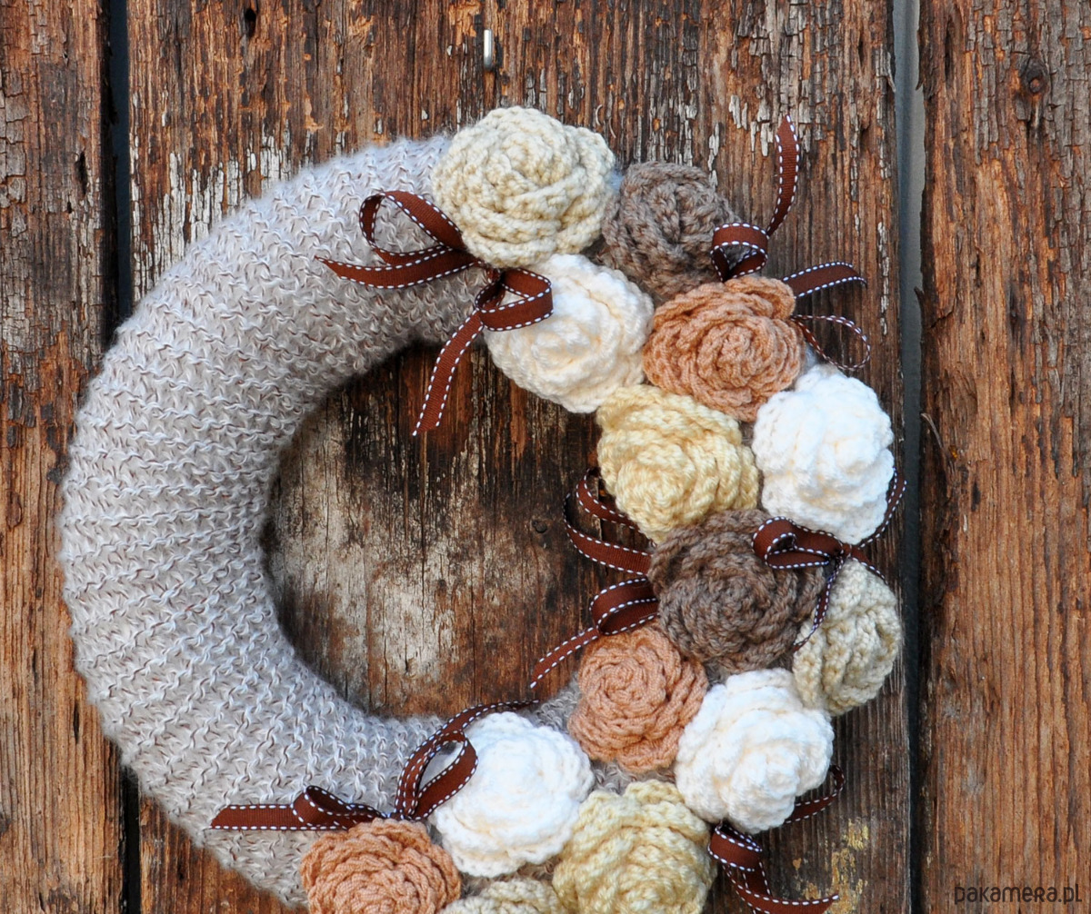Piękny i wyjątkowy wianek w szarym sweterku ozdobiony szydełkowymi różami w odcieniach beżu oraz wstążką; średnica ok.30cm; wianek przystosowany do powieszenia na drzwiach, ścianie lub w oknie; wianki występują w pojedynczych egzemplarzach, nie ma możliwości powtórzenia wzoru; zapraszam serdecznie