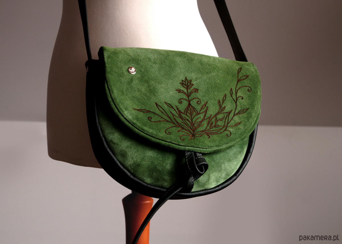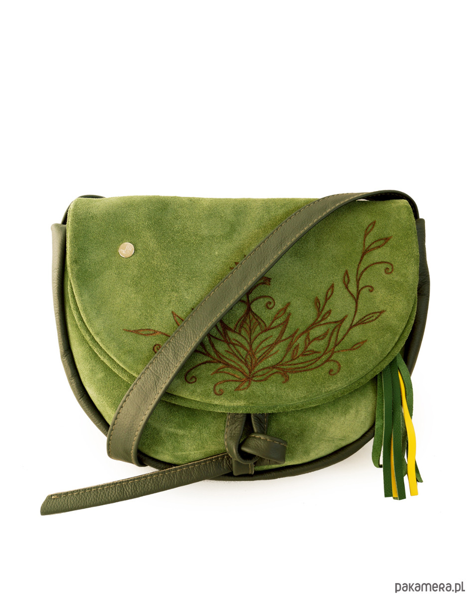 Subtelna, kobieca torebka o lekkim, półokrągłym kroju. Uszyta z zielonych skór naturalnych – licowej i zamszowej. Ręcznie wypalony motyw kwiatu lotosu. Składa się z głównej komory, w której znajdują się kieszeń na zamek i dwie kieszenie otwarte oraz z tylnej, zasuwanej kieszeni. Wymiary – 22/28/7cm, długość regulowanego paska – max. 130cm.