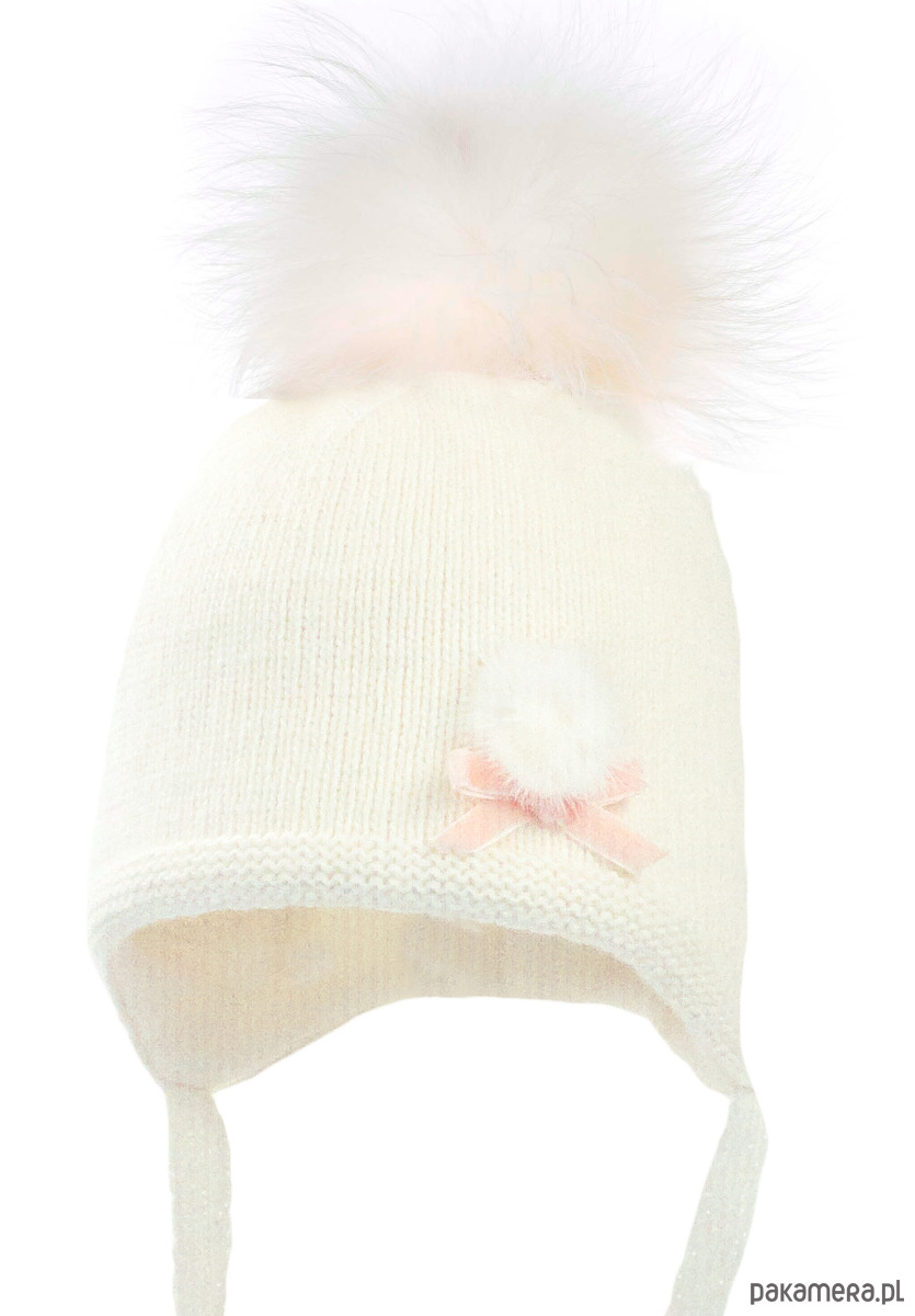 Wiązanie pod szyją zapobiega zsuwaniu się czapki i zdejmowaniu jej przez dziecko, a pompon z futra naturalnego dodaje jej niepowtarzalnego uroku.