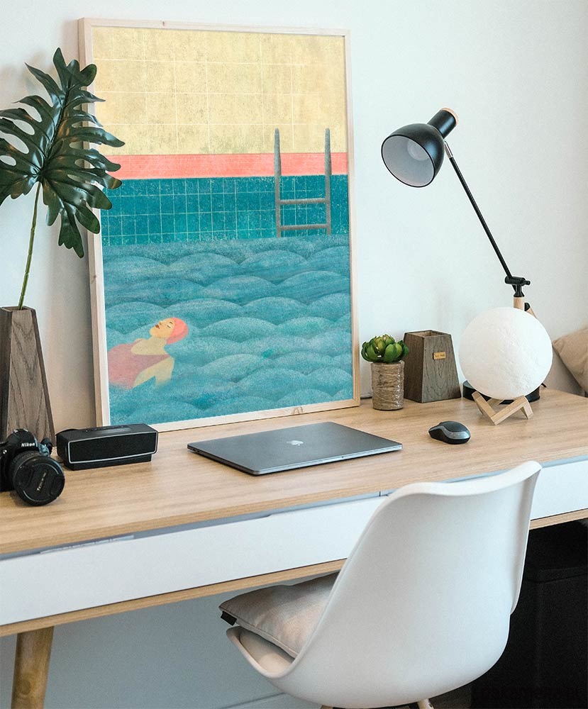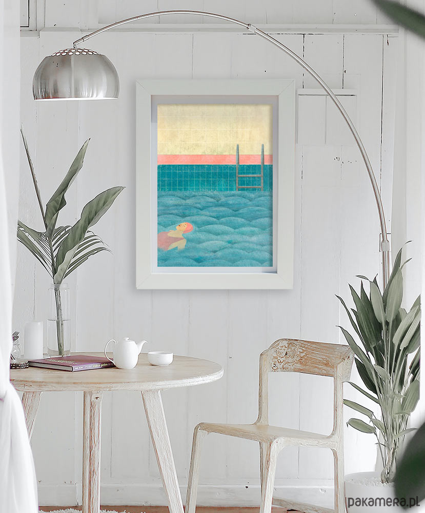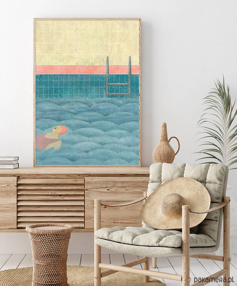 Plakat z autorską grafiką przedstawiający dziewczynę spokojnie unoszącą się na falach wody basenu. Grafika zaprojektowana przez pracownię Mayam posters.