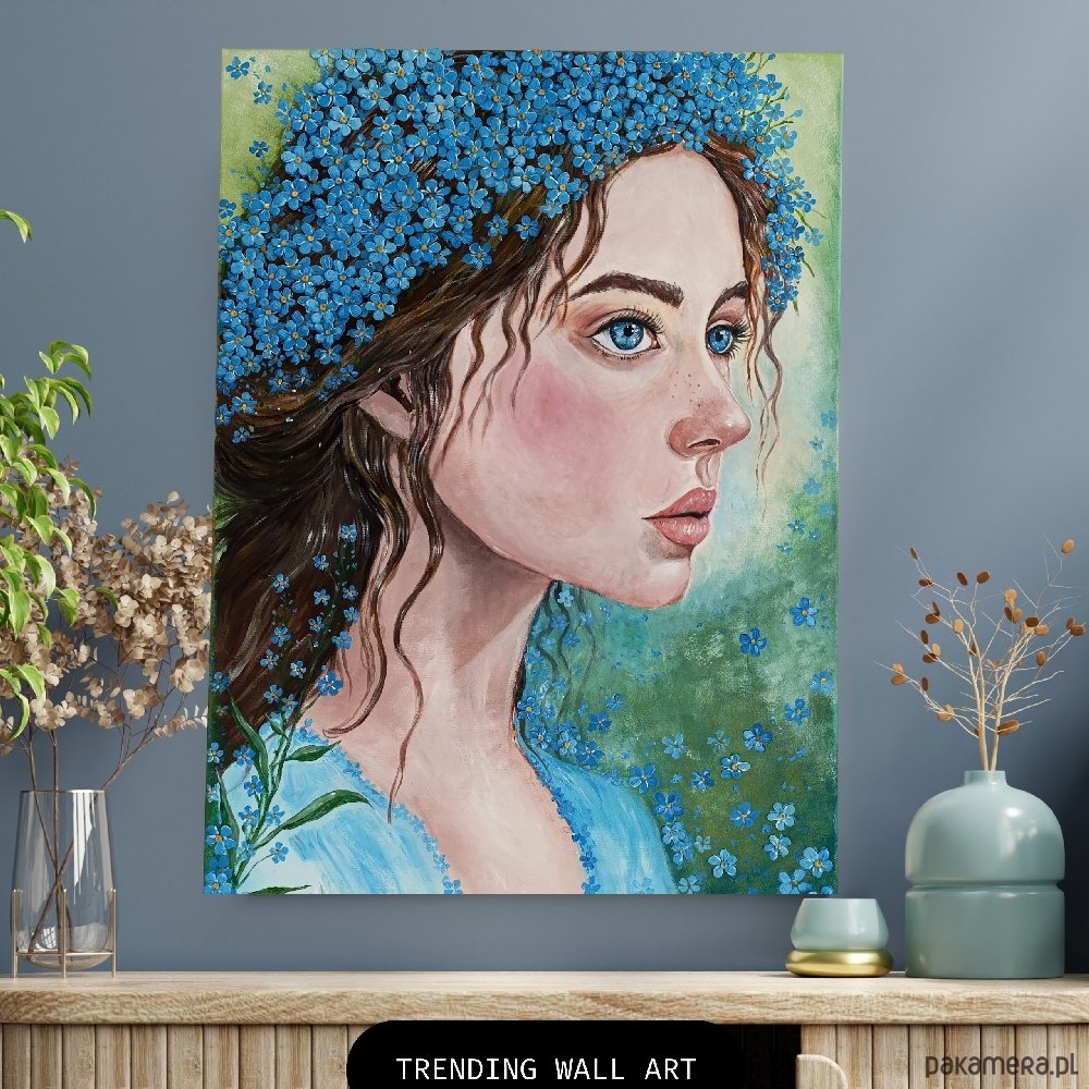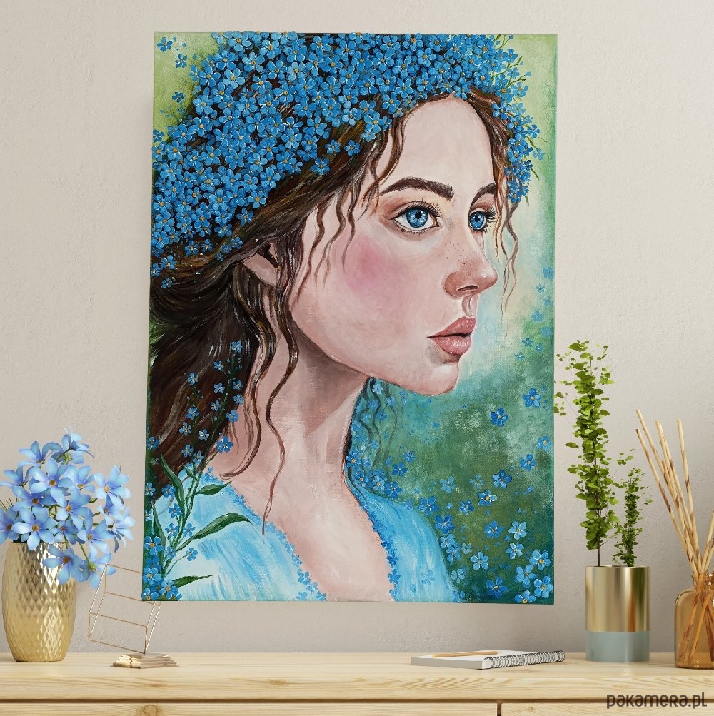 Dominują tu odcienie zieleni i błękitu, tworzące spokojną, harmonijną kompozycję. Dziewczyna z wiankiem z niezapominajek emanuje lekkością, wrażliwością i bliskością natury. To obraz, który doda wnętrzu świeżości, romantycznego charakteru i artystycznego akcentu.