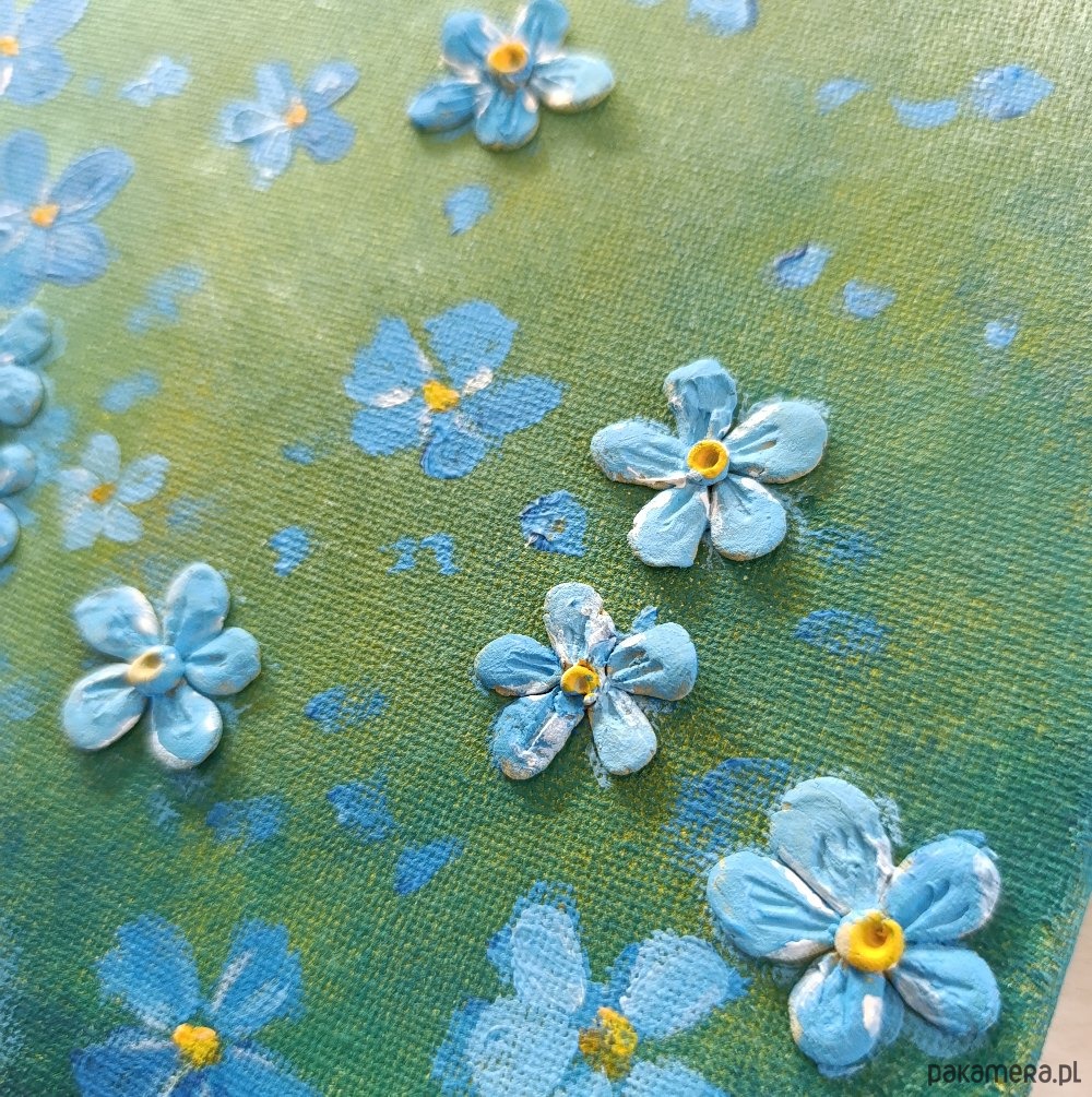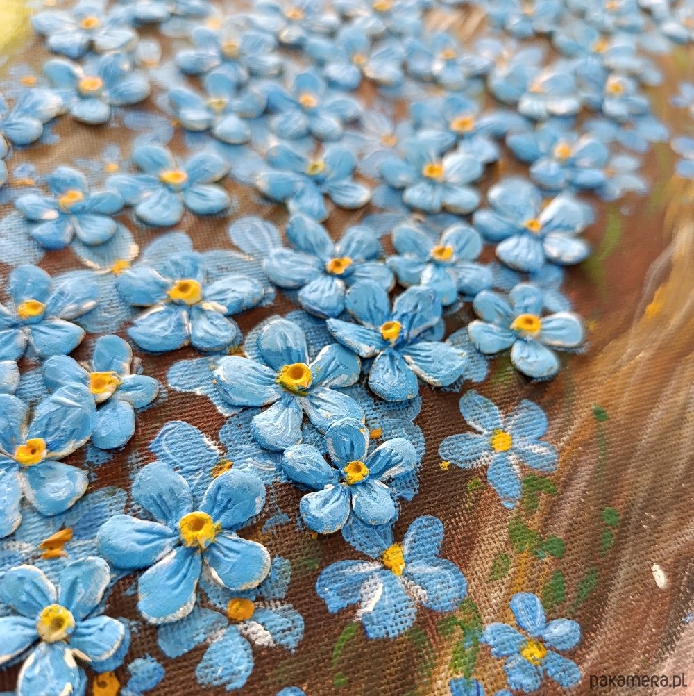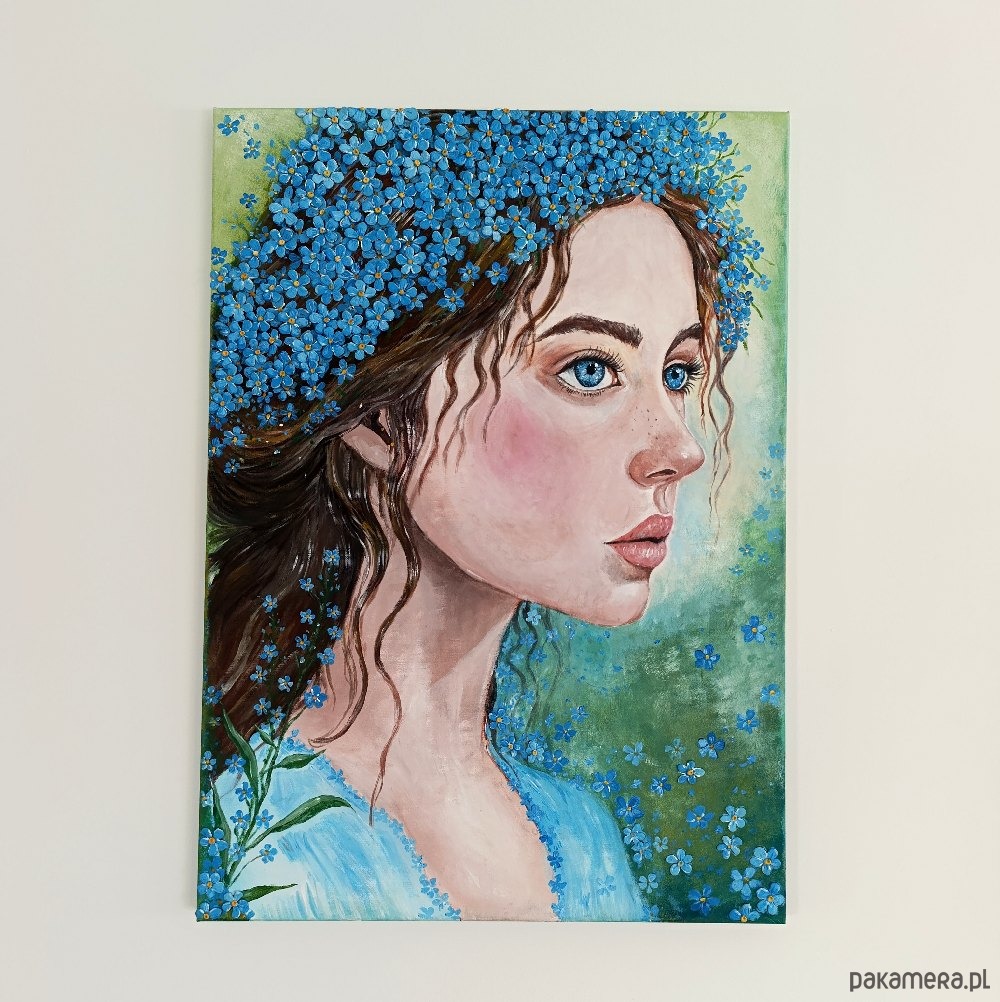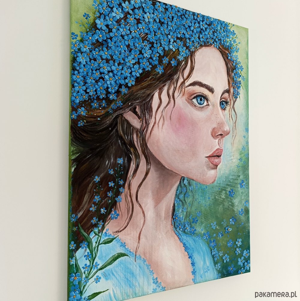Ręcznie malowany wysokiej jakości farbami akrylowymi obraz na płótnie. To subtelny portret kobiety zanurzonej w świecie niezapominajek — delikatnych, ale pełnych symboliki kwiatów. W obrazie połączyłam malarstwo z rzeźbieniem struktury, dzięki czemu kwiaty są trójwymiarowe i niemal „dotykalne”.