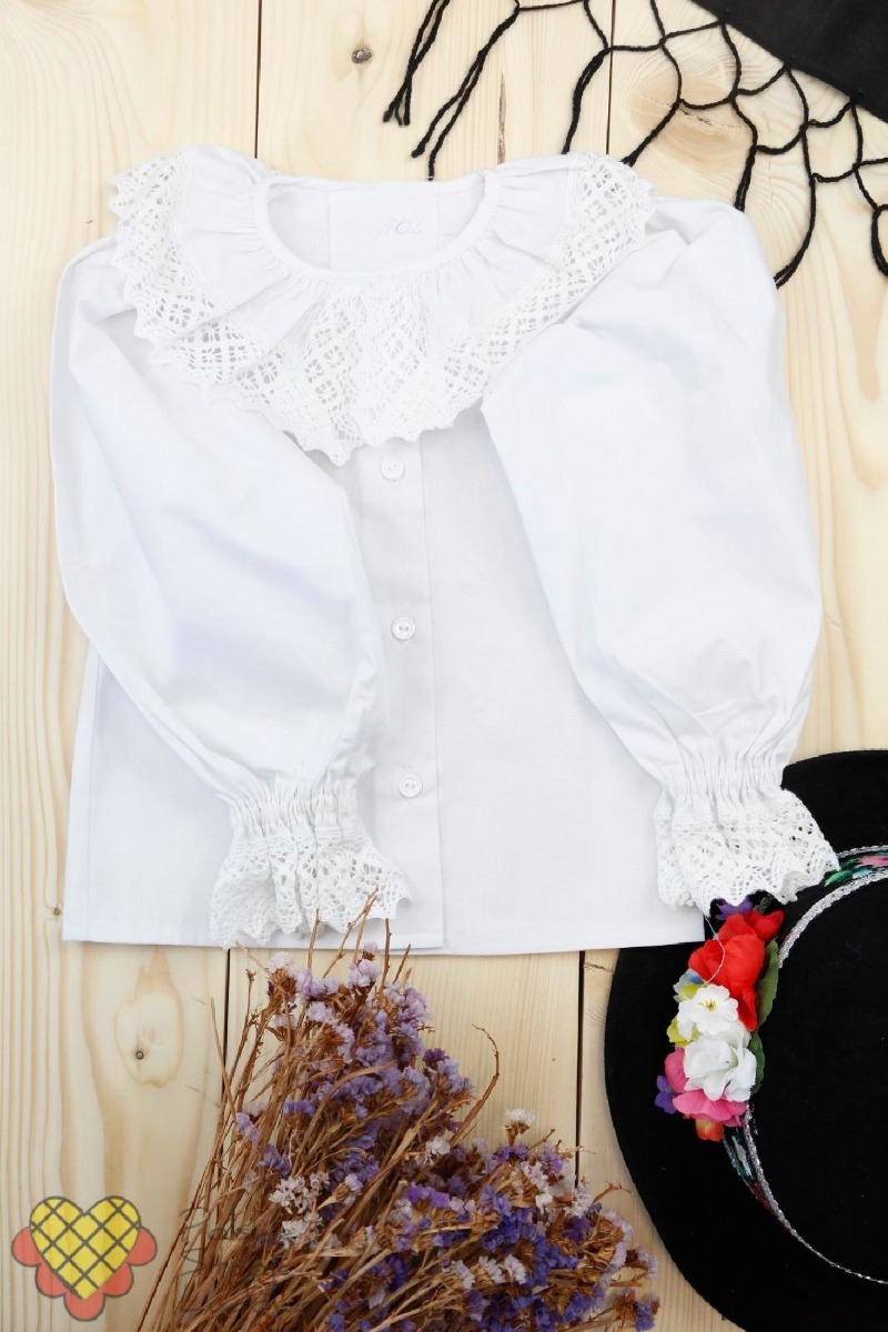 Ludowa biała bluzka zdobiona szeroką, bawełnianą koronką.