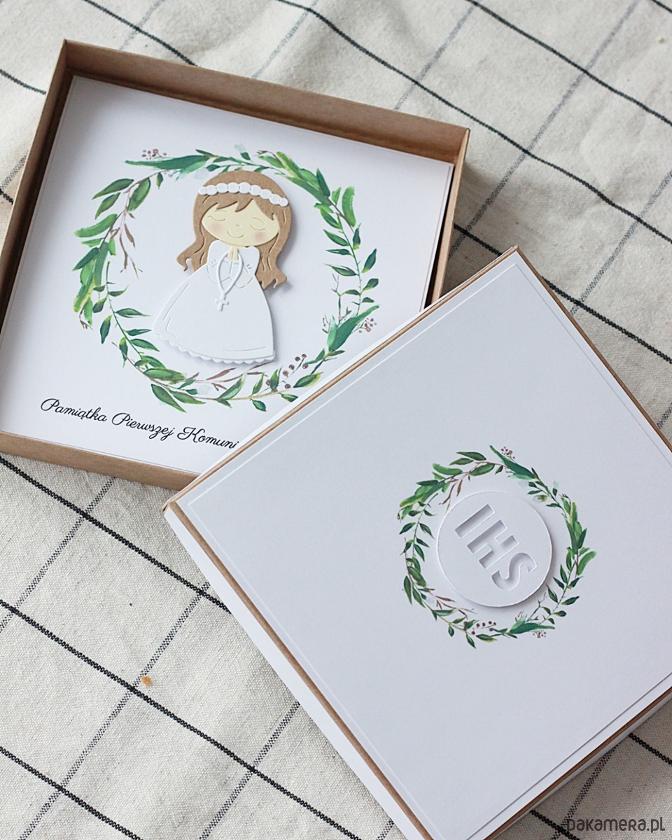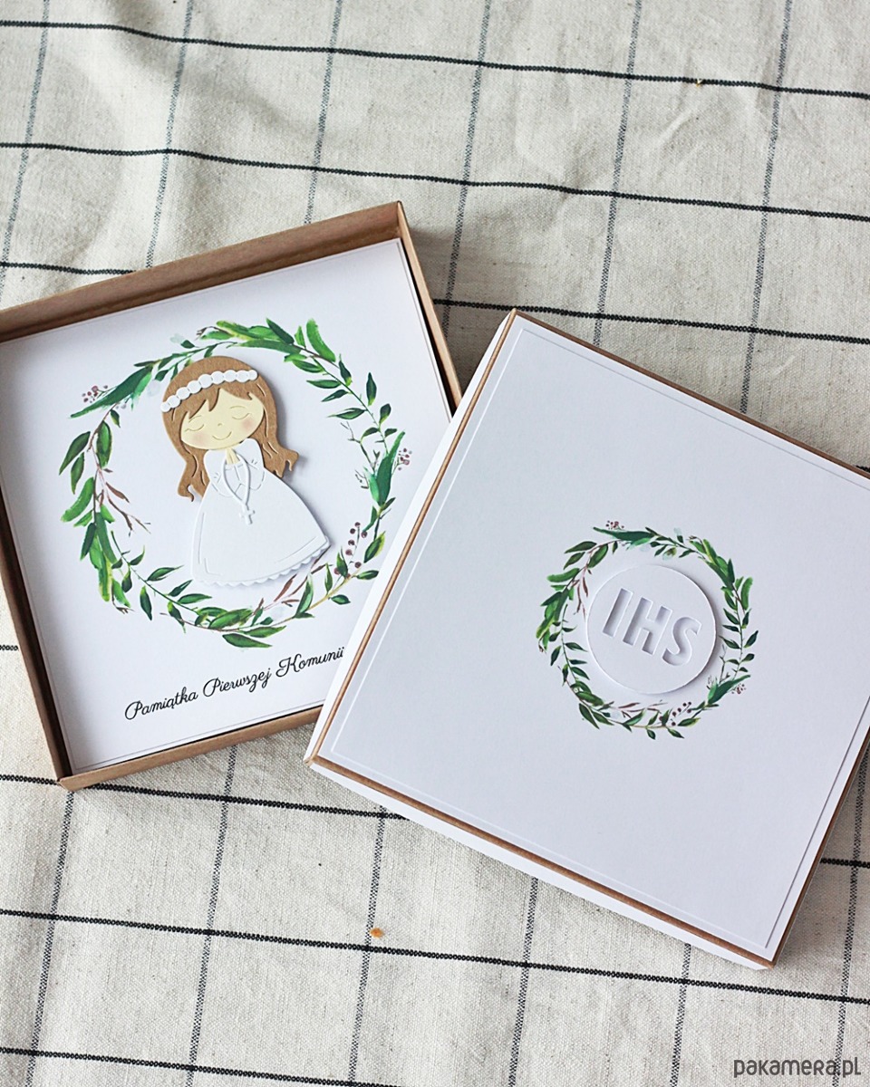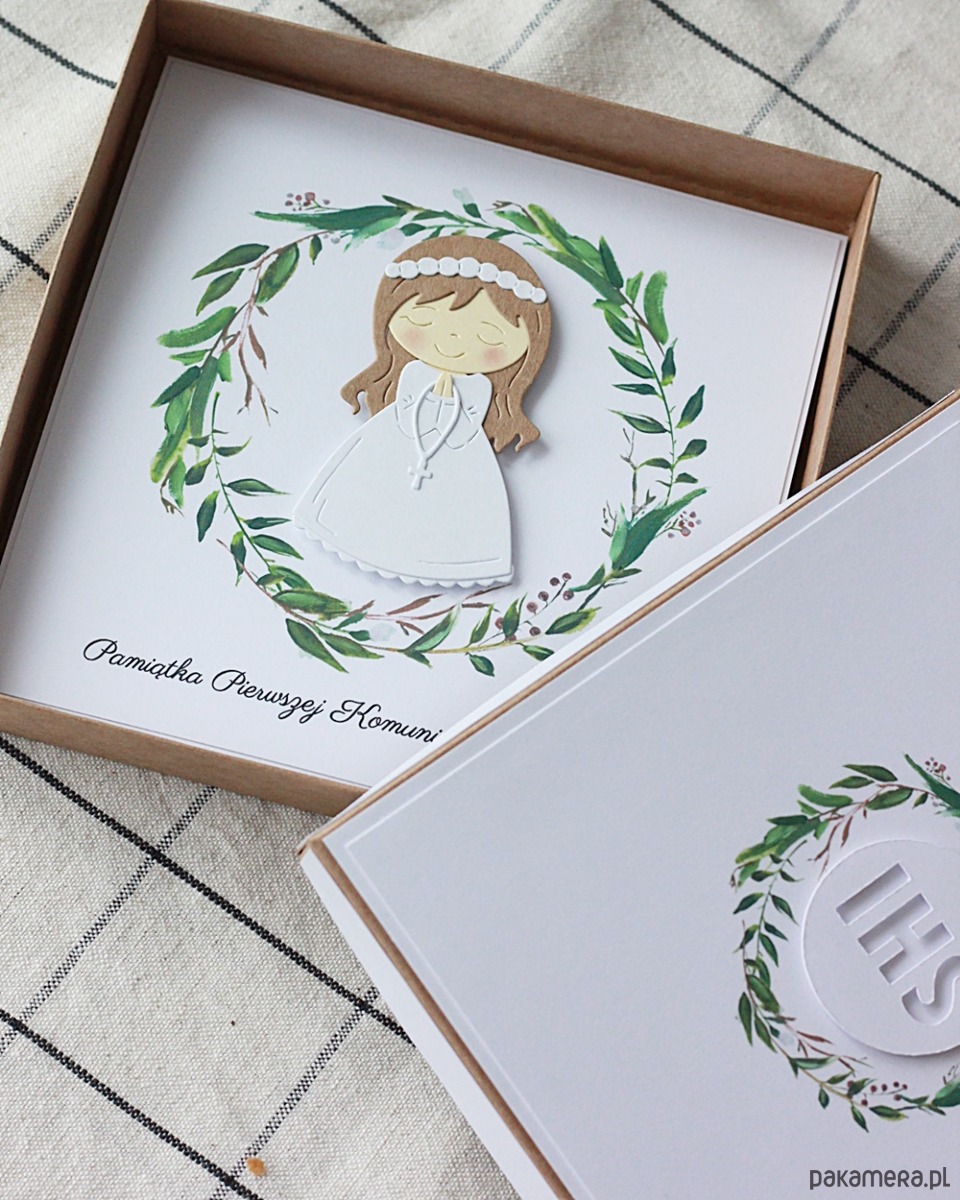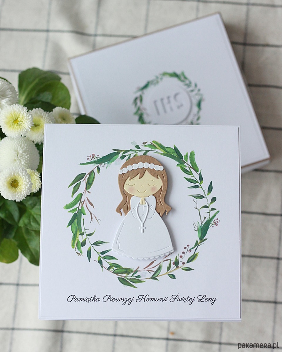 Kartka komunijna z postacią dziewczynki na tle zielonego wianuszka. W komplecie z pudełkiem.