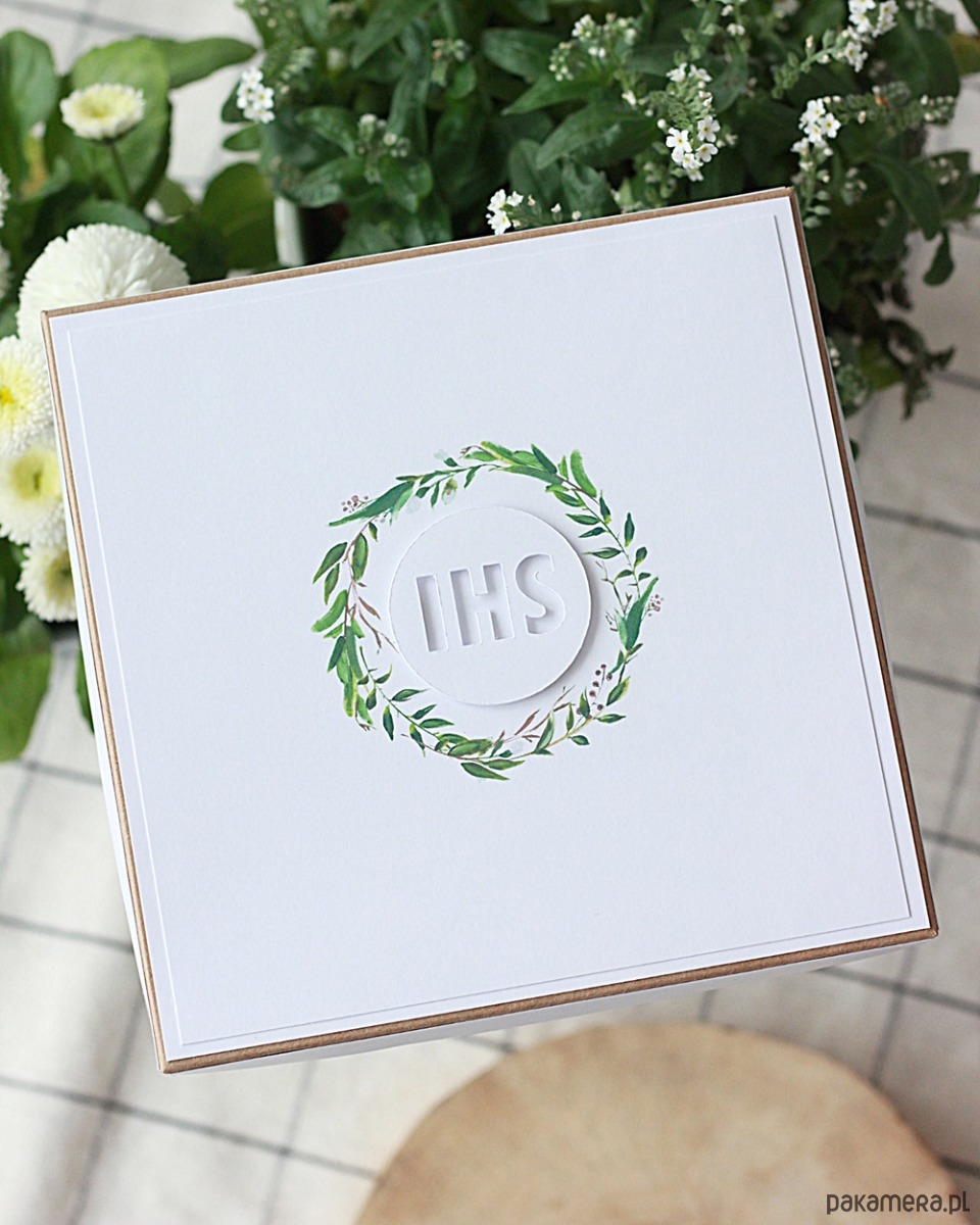 Pudełko wykonane z papieru ekologicznego. Wieczko ozdobione papierem białym z roślinną grafiką i przestrzennie naklejoną hostią.