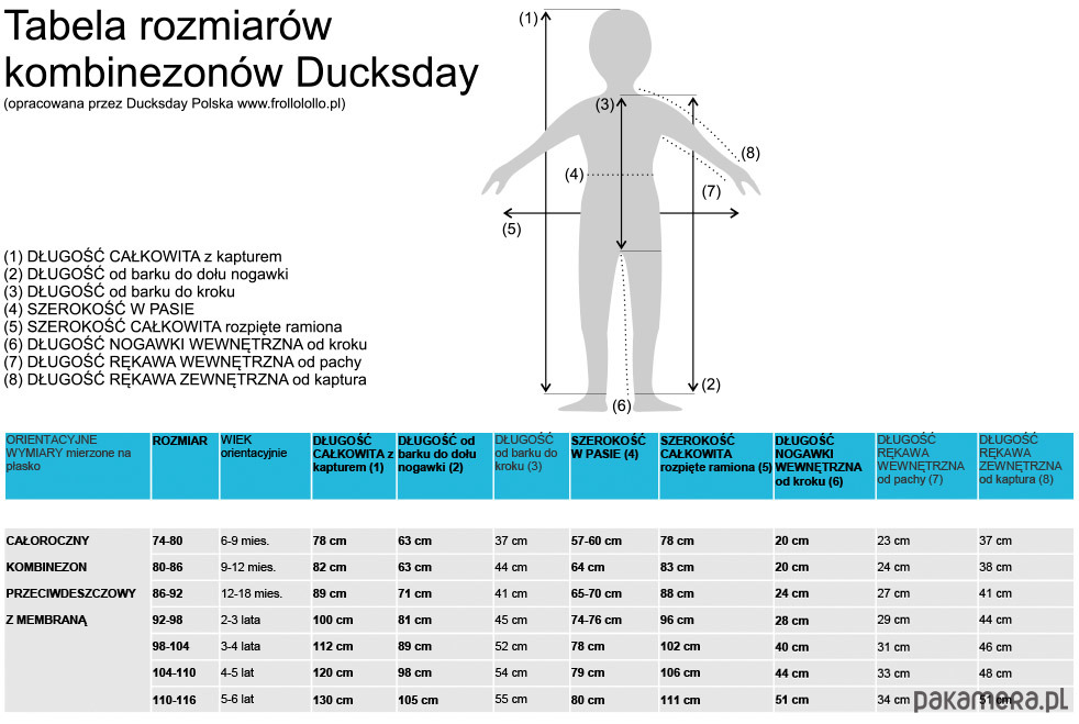 UWAGA! Kombinezony przeciwdeszczowe od rozmiaru 92-98 wzwyż mają zawyżoną rozmiarówkę, przed zakupem prosimy sprawdzić wymiary (podane w tabeli na zdjęciu).