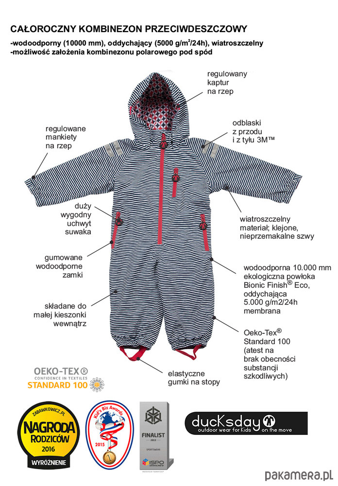Jednoczęściowy, całoroczny kombinezon przeciwdeszczowy (bez ociepliny) dla dzieci Ducksday, dzięki wysokiej funkcjonalności i właściwościom takim jak wodoodporność, wiatroszczelność i oddychalność zapewni Twojemu Maluchowi ciepło i wygodę podczas zabaw na świeżym powietrzu, jednocześnie ochroni przed złą i wietrzną pogodą przez 365 dni w roku. Wysokiej jakości, wygodny i praktyczny kombinezon dla dzieci z membraną to wielokrotnie nagradzany flagowy produkt firmy Ducksday. Wyróżniony m.in.: nagrodą ISPO BRANDNEW na największych targach outdoorowych ISPO w Monachium; Nagrodą Rodziców od portalu Zabawkowicz.
