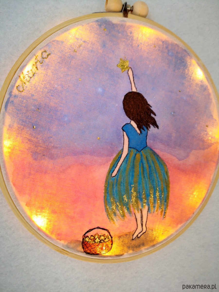 Obrazek został ręcznie wyhaftowany na płótnie bawełnianym, pomalowany jest farbami akwarelowymi.