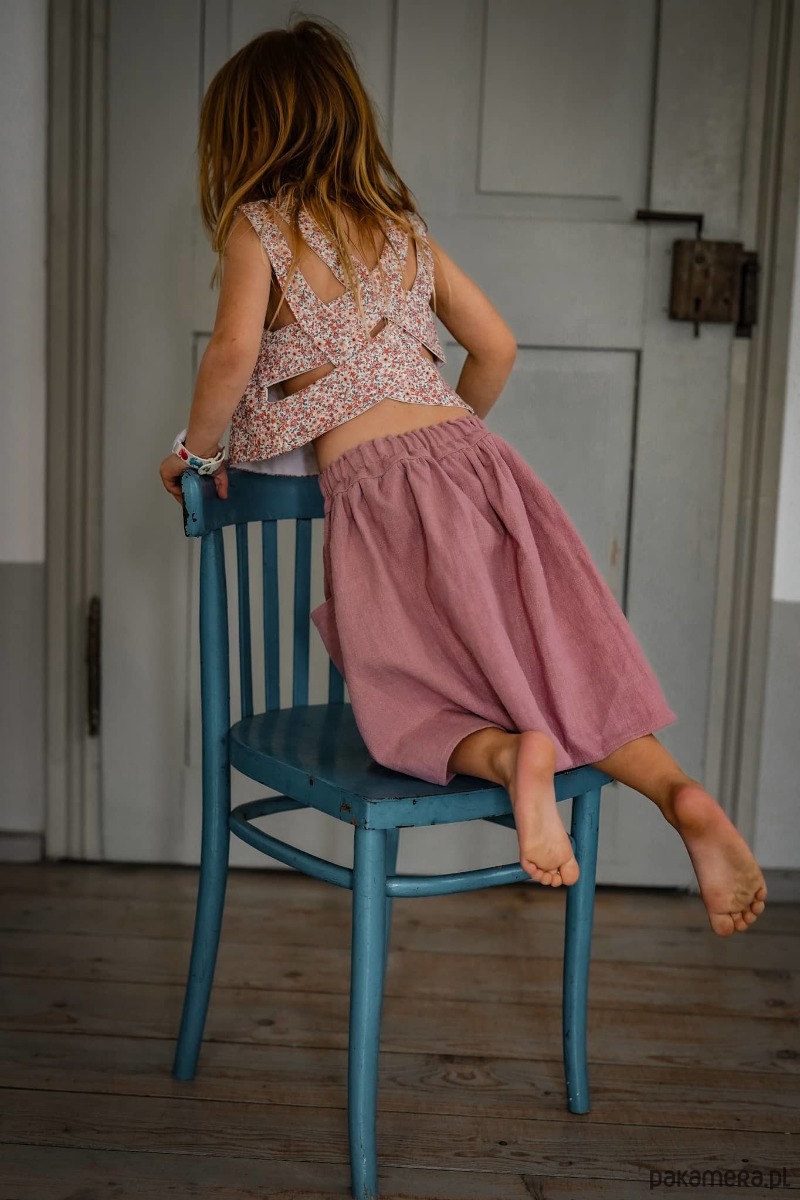 Z pięknego i miłego w dotyku lnu w kolorze różowym powstała wyjątkowa spódniczka dla dziewczynek. Sprawdzi się idealnie w upalne dni oraz chłodne jesienne wieczoru, ponieważ uszyta jest z lnu. Spódniczka jest wygodna, z tyłu w pasie dodaną ma gumkę. Ma dwie kieszonki na wszystkie dziecięce skarby!