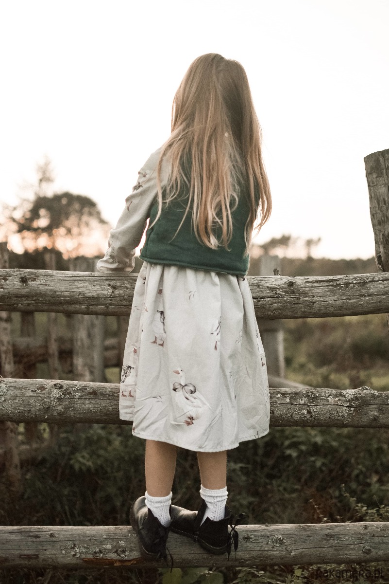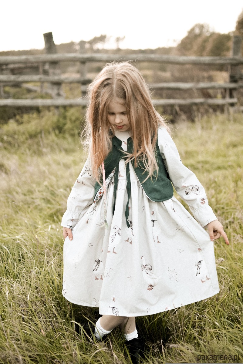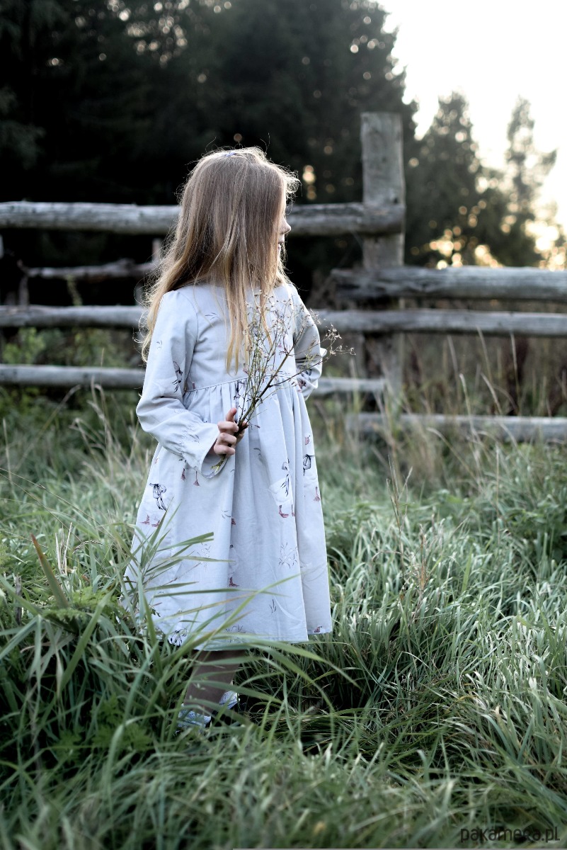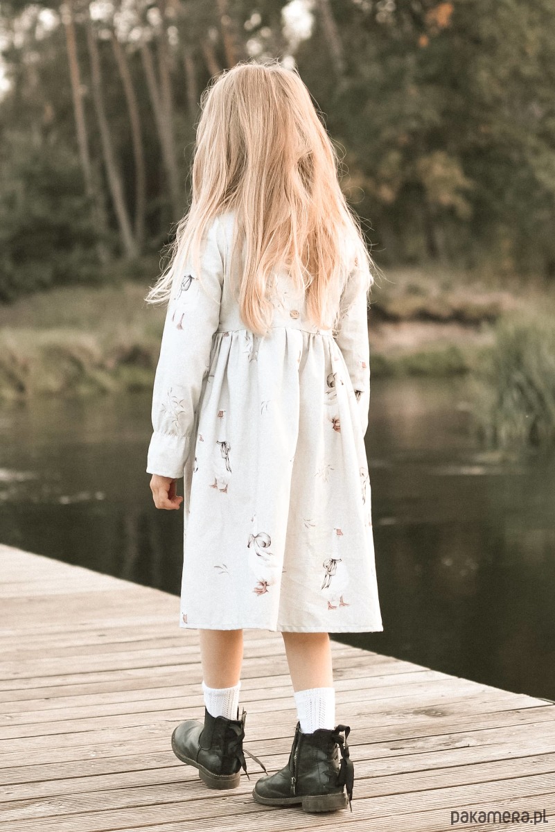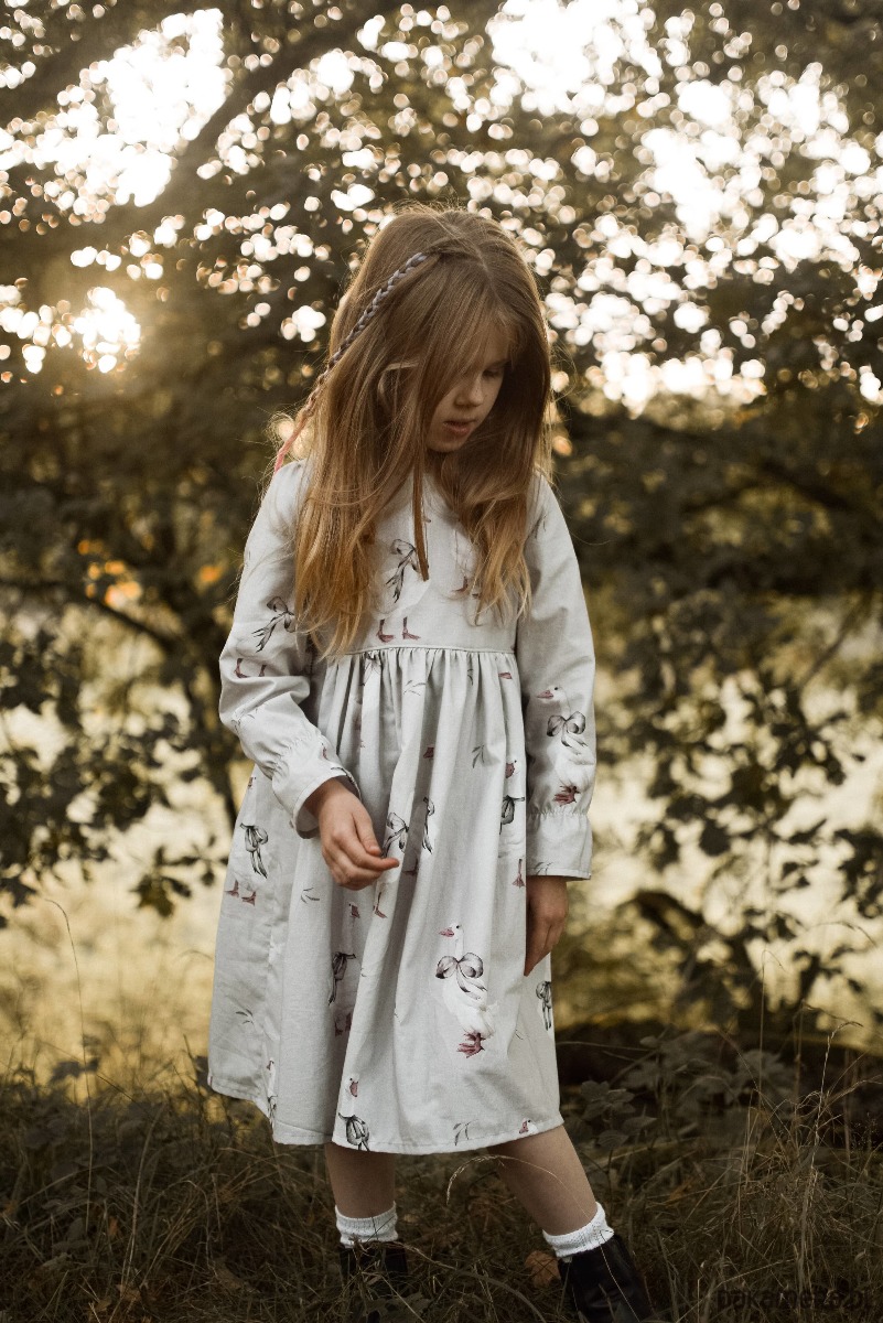 Sukienka wykonana z tkaniny bawełnianej, w kolorze szarym z uroczym printem w białe gąski. Zapinana z tyłu na trzy kokosowe guziki.