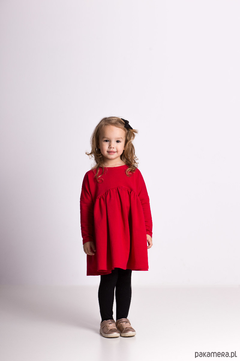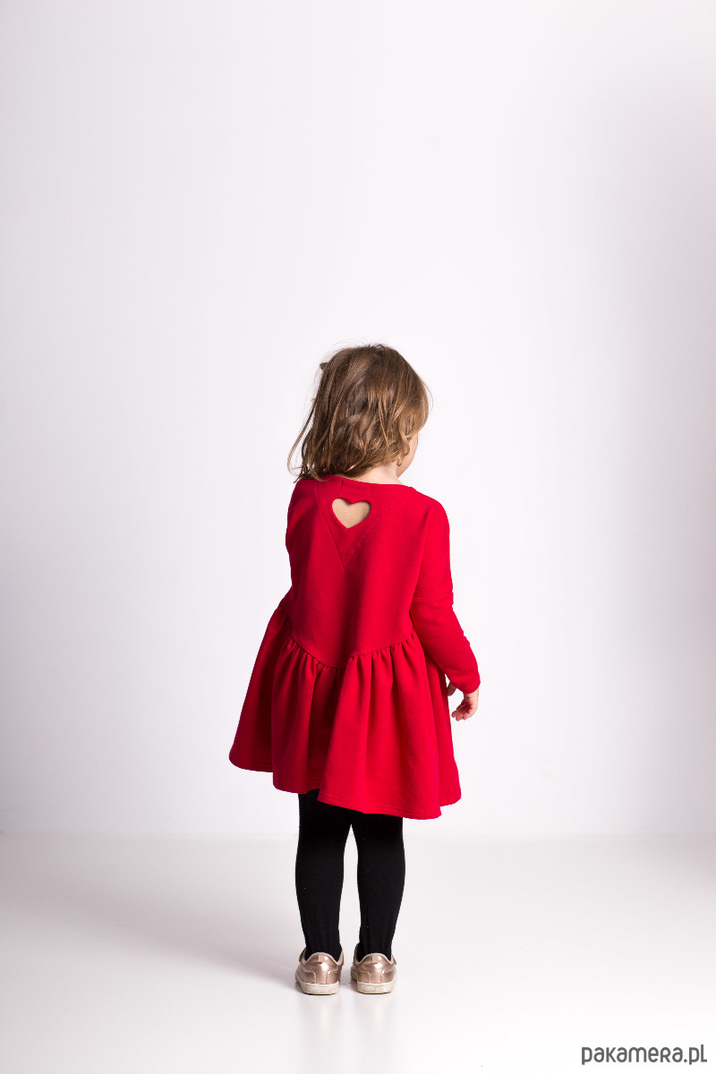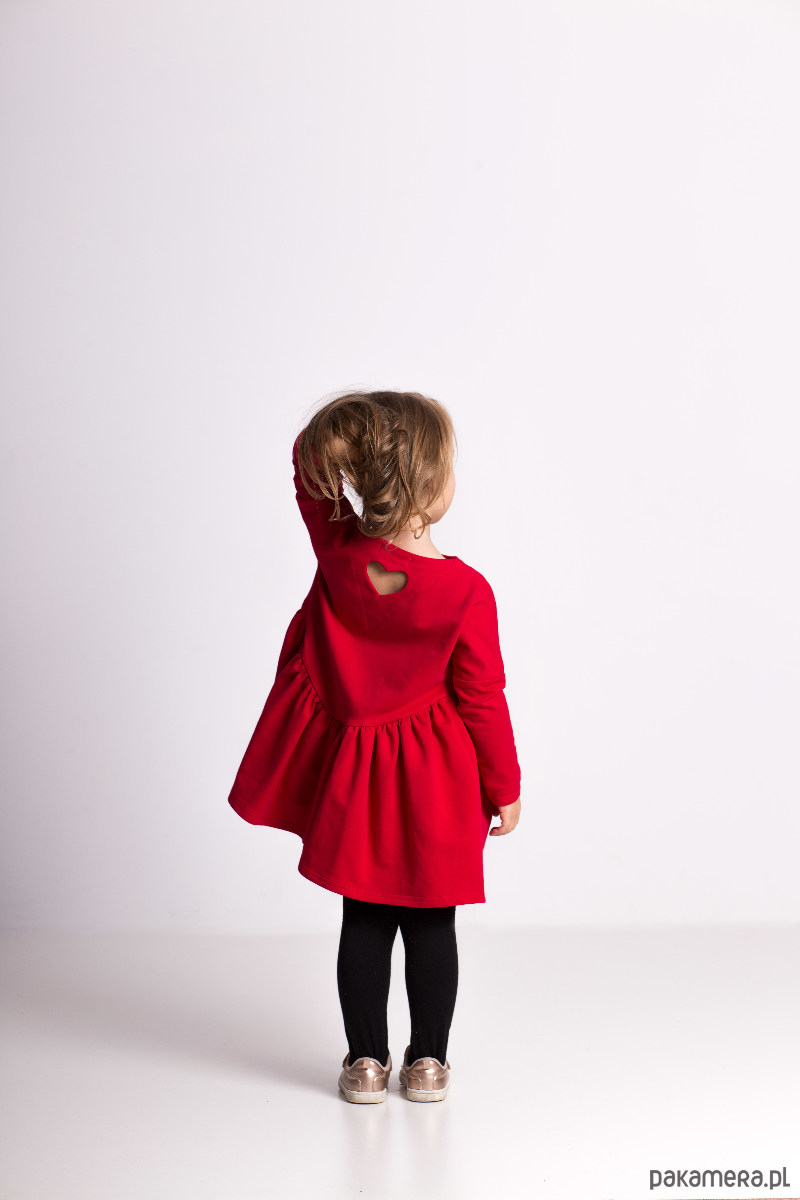 Śliczna luźna sukienka, wykonana z elastycznej dzianiny dresowej. Pięknie się układa i jest niesamowicie wygodna, rewelacyjnie wygląda również z kamizelką lub sweterkiem. Z tyłu posiada urocze serduszko, które sprawia, że jest oryginalna i niepowtarzalna!