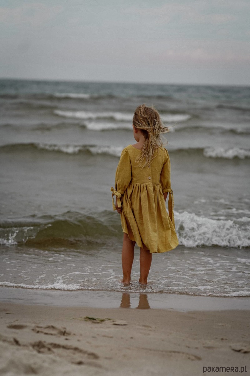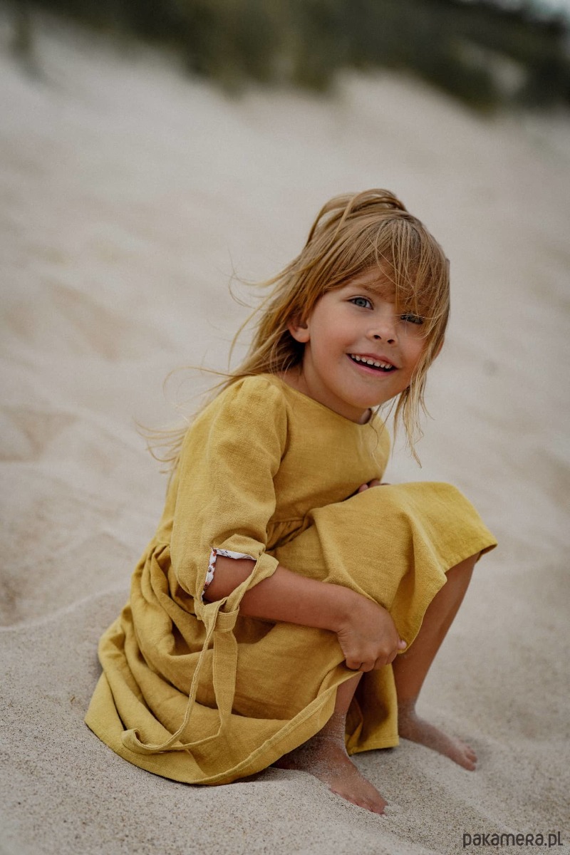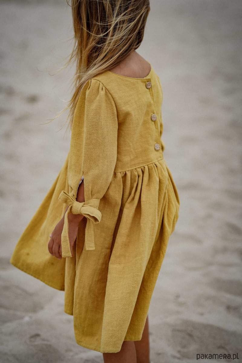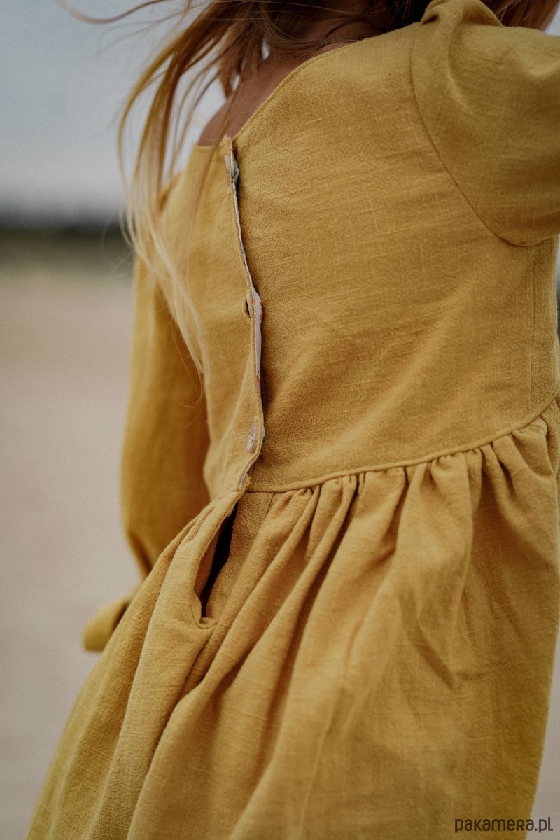 Sukienka w ciepłym żółtym odcieniu wywołuje mnóstwo pięknych wspomnień. Beztroskie dzieciństwo, zapach jeszcze zielonego lasu, zachodzące słońce wrześniowego popołudnia...