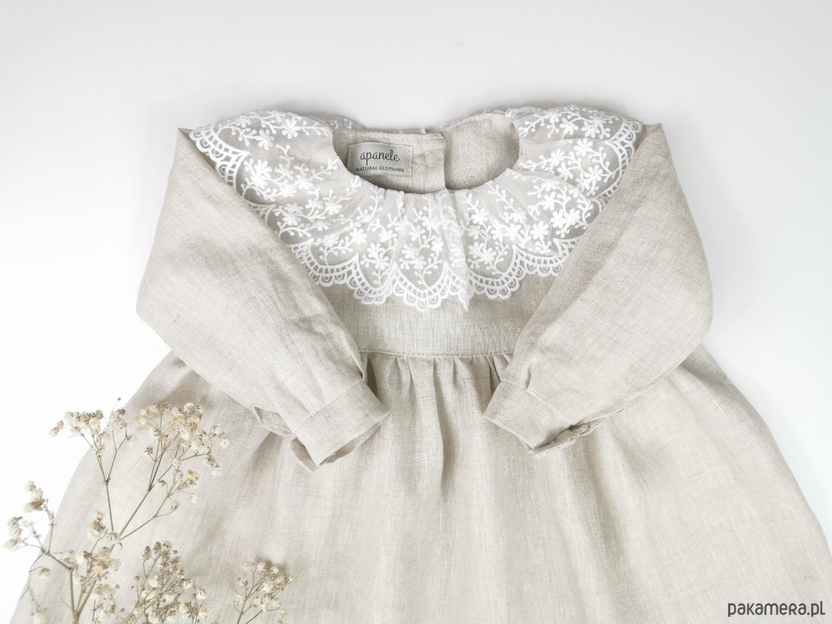 Dekolt wykończony piękną koronką z kwiatowym haftem. Delikatna i ponadczasowa, stanowi idealne ubranie które podkreśla urodzę dziecka, nie przyćmiewając jej.