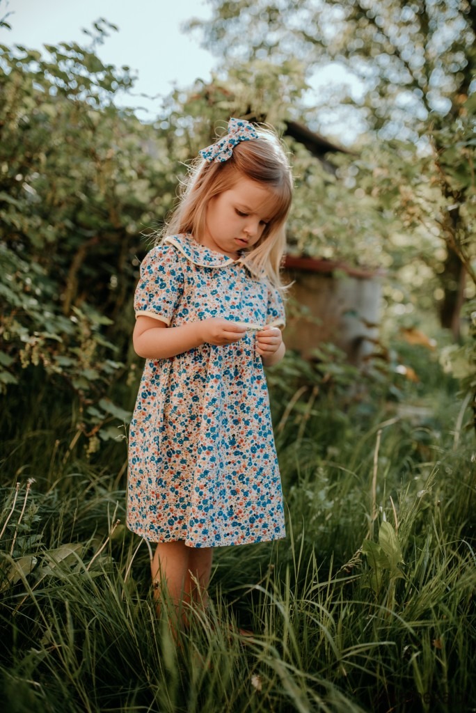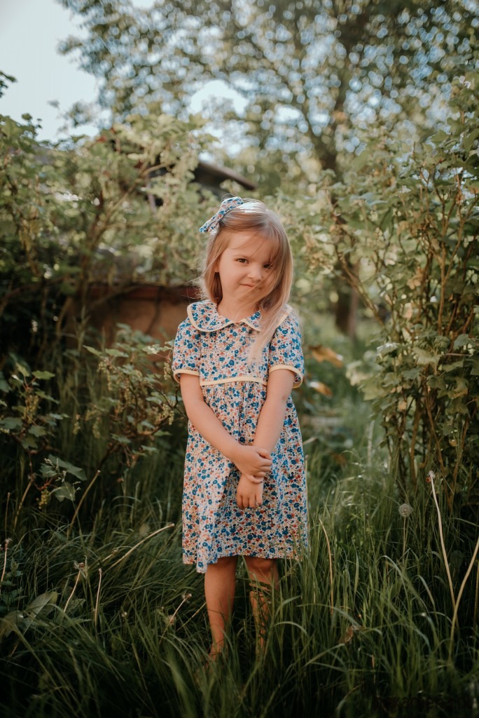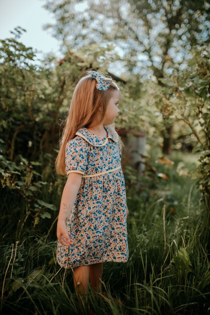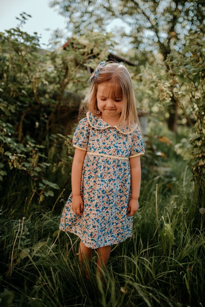 Grace znaczy wdzięk, urok. Taka właśnie jest ta wyjątkowa sukienka! Uszyta z wysokiej jakości bawełny w kolorowe kwiaty. Kołnierzyk, rękawki i pas sukienki obszyte są subtelną, żółtą lamówką. Na pewno zagości w szafie nie jednej dziewczynki!