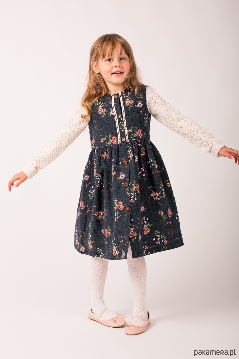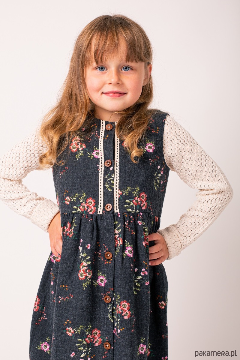 Wiskozowa sukienka bez rękawów, zapinana na drewniane guziczki na całej długości. Subtelny kwiecisty wzór oraz marszczenie w talii nadaje niesamowitego wdzięku. Dodatkiem jest minimalistyczna bawełniana taśma oraz wiskozowa podszewka w kolorze ecru. Nosząc tę sukienkę z naszą koszulą Amandą, możemy stworzyć piękny total look.