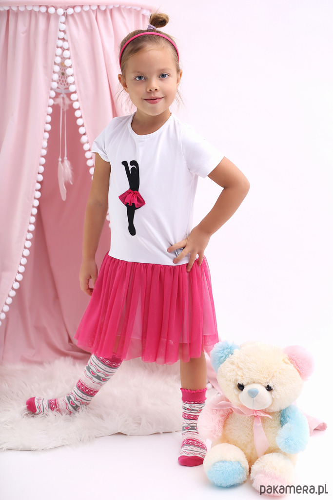 Połączenie szarej dzianiny z mięciutkim, kolorowym tiulem. Z przodu ozdobna aplikacja baletnicy.