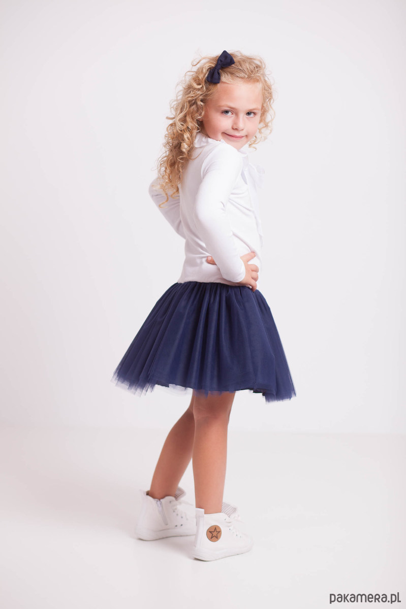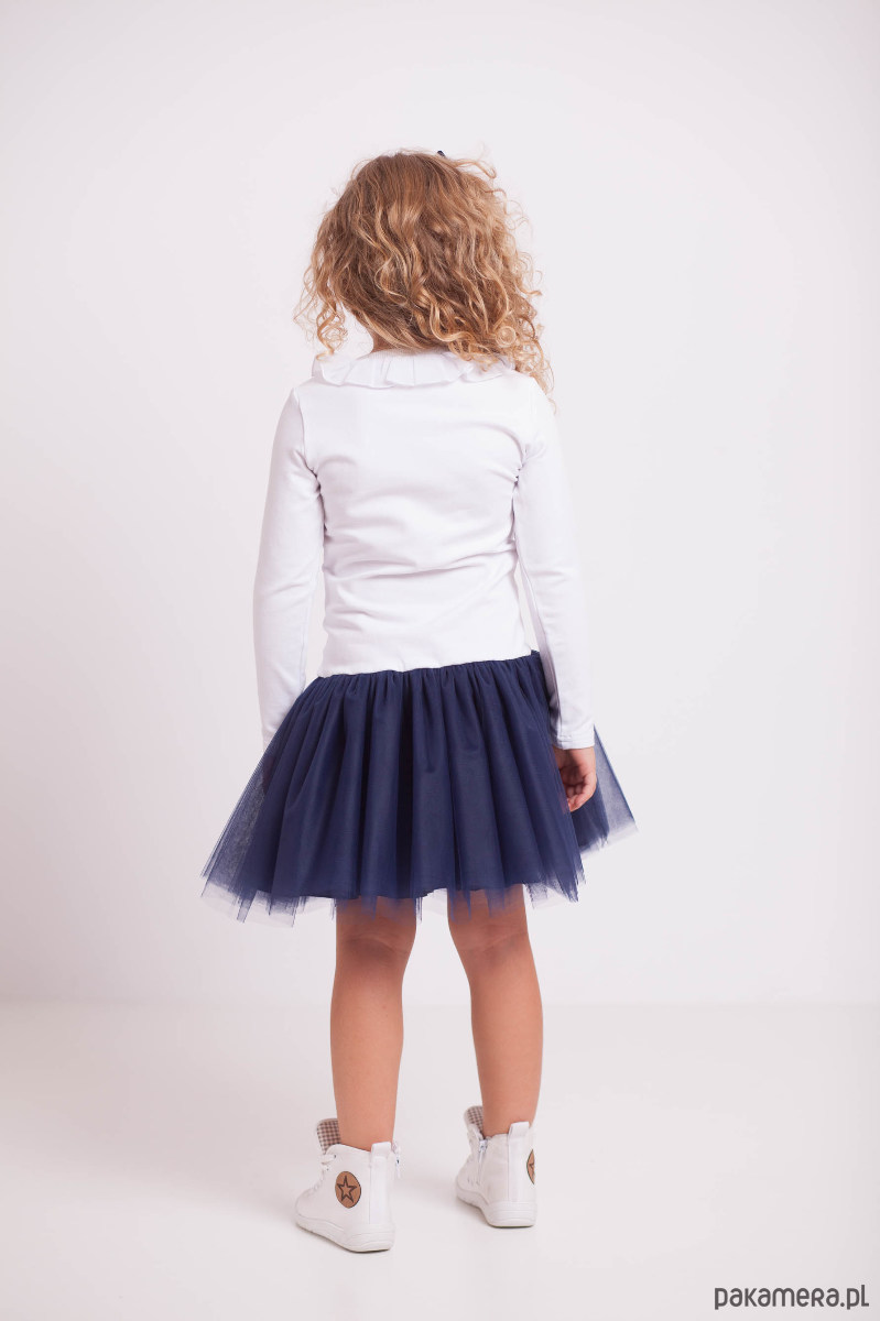 Góra sukienki wykonana z elastycznej dzianiny, szyja wykończona ściągaczem. Dekolt ozdobiony falbanką z żorżety. Do dołu jest doszyta granatowa spódniczka składająca się z 8 warstw tiulu oraz podszewki, dzięki czemu jest stercząca i pięknie się układa :)