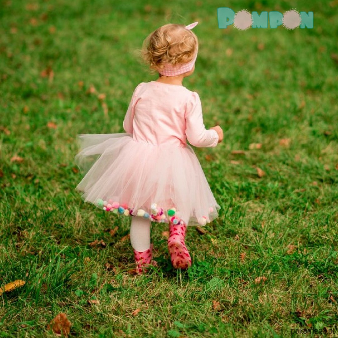 Sukienka Fluffy to uroczy pudrowy róż i aż cztery warstwy miękkiego tiulu, które kryją w sobie puszyste pomponiki gotowe do zabawy!