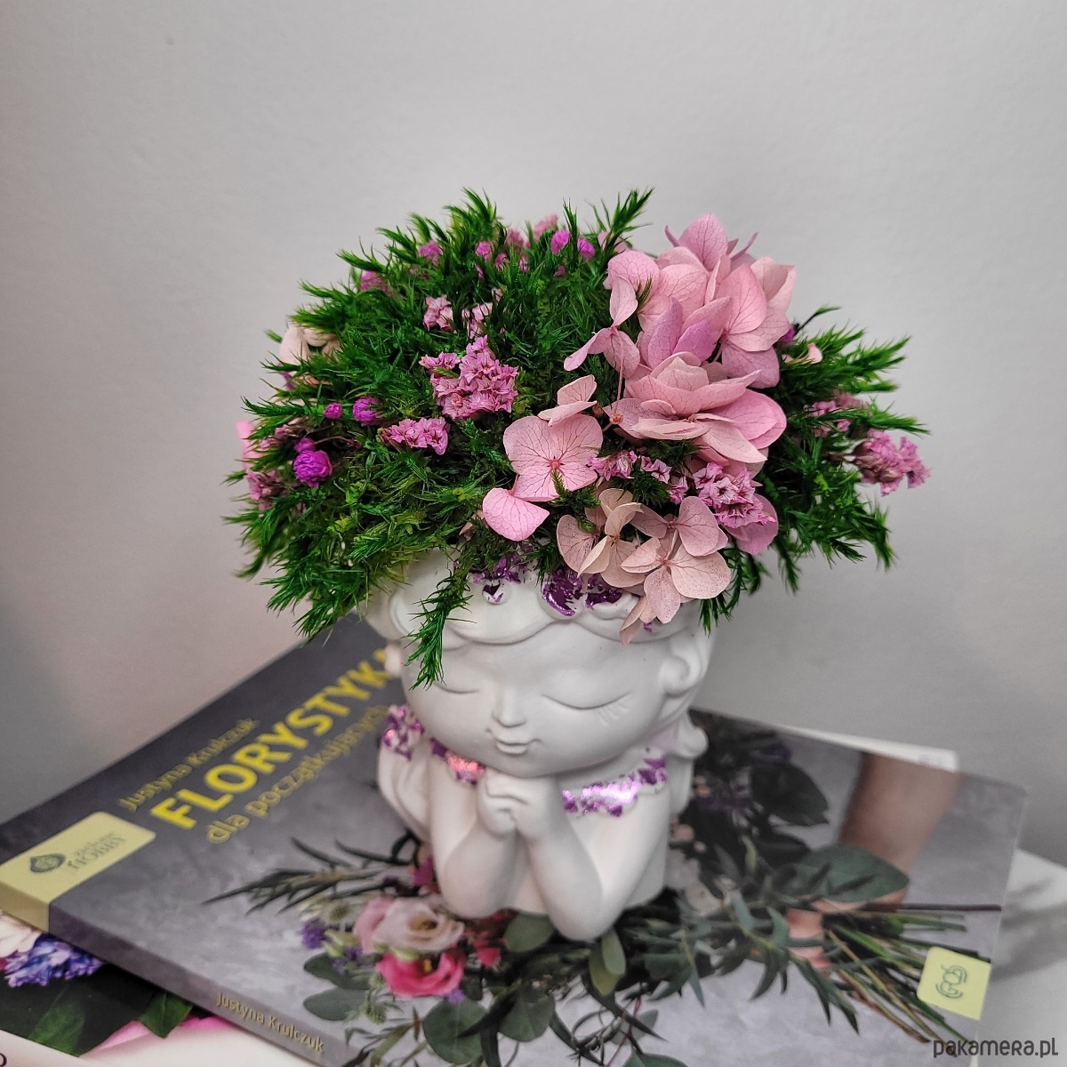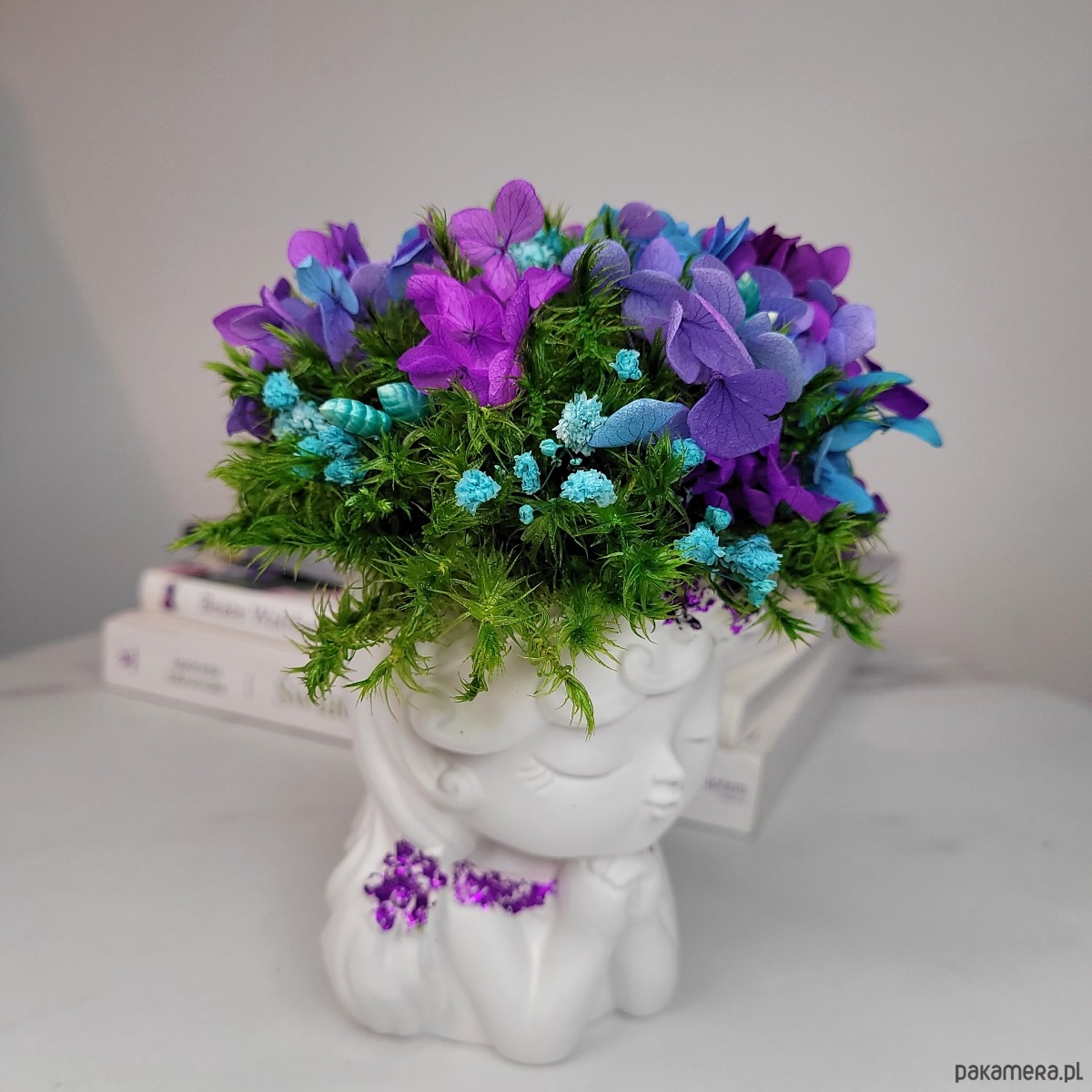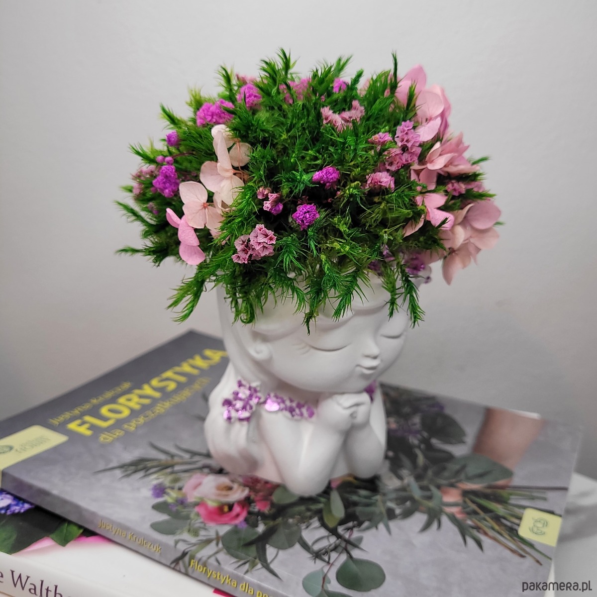 Dziewczynka w zamyślonej pozie jakby marzyła, a jej fryzura zamieniła się w bukiet ze stabilizowanego mchu i suszonych kwiatów — nie wymagają pielęgnacji i zachowują świeżość przez długie lata.