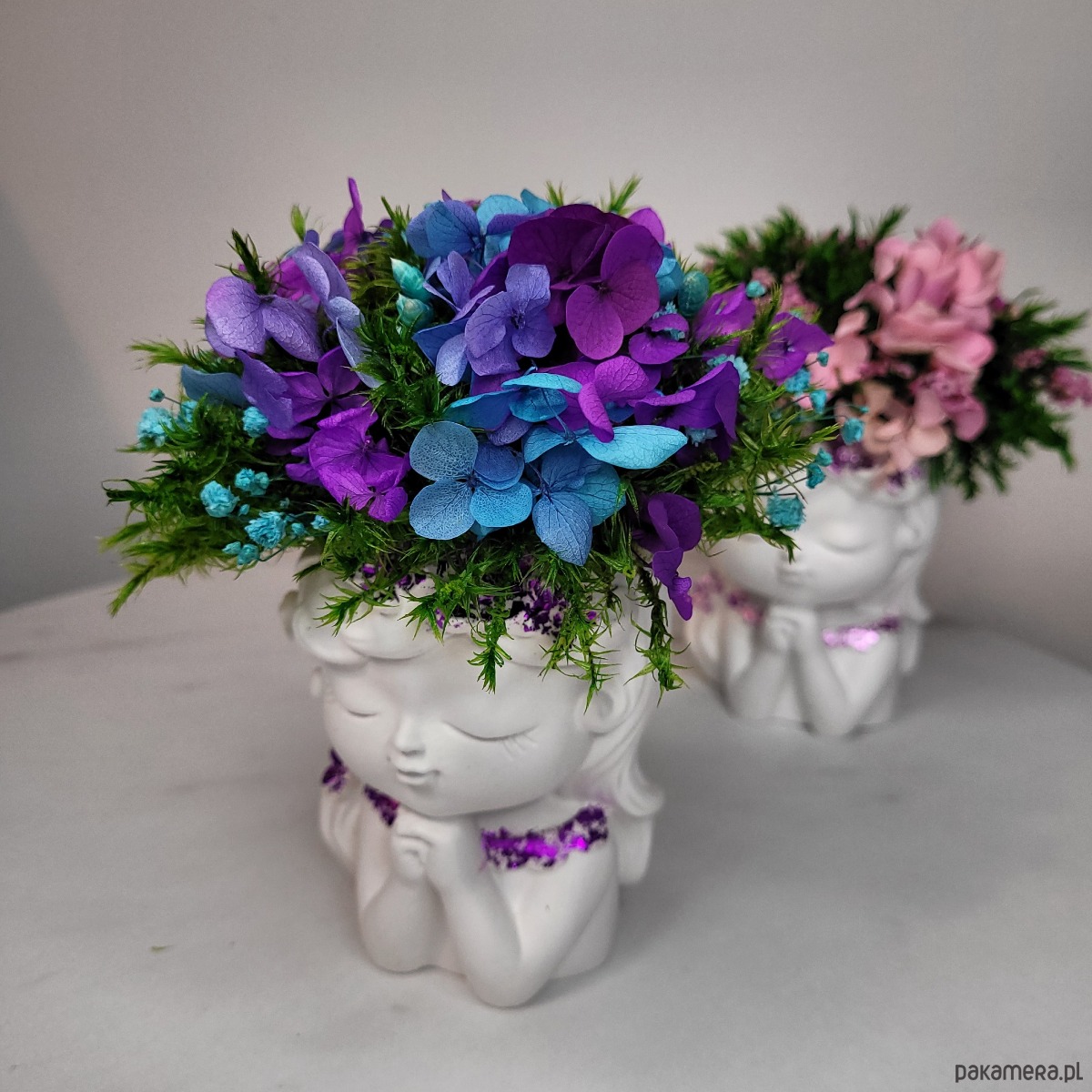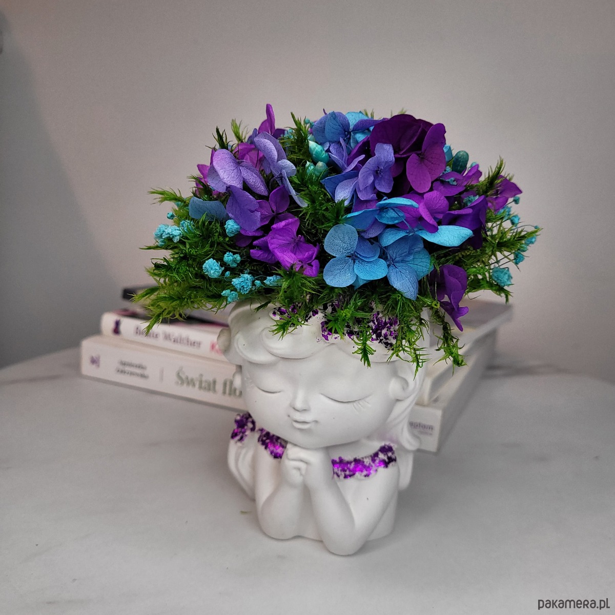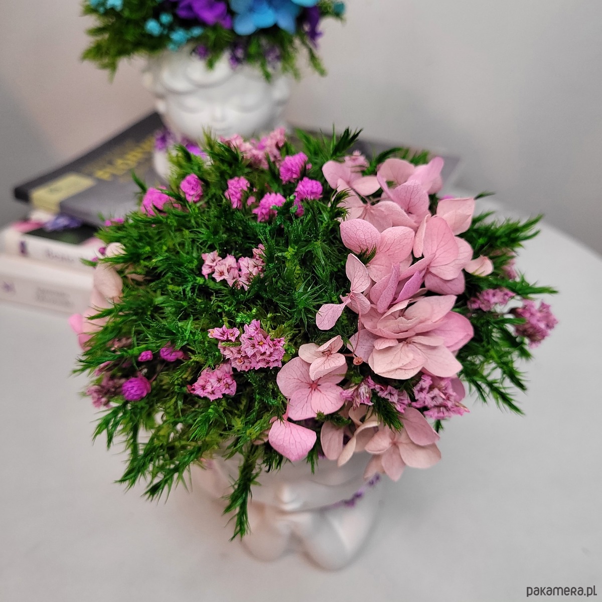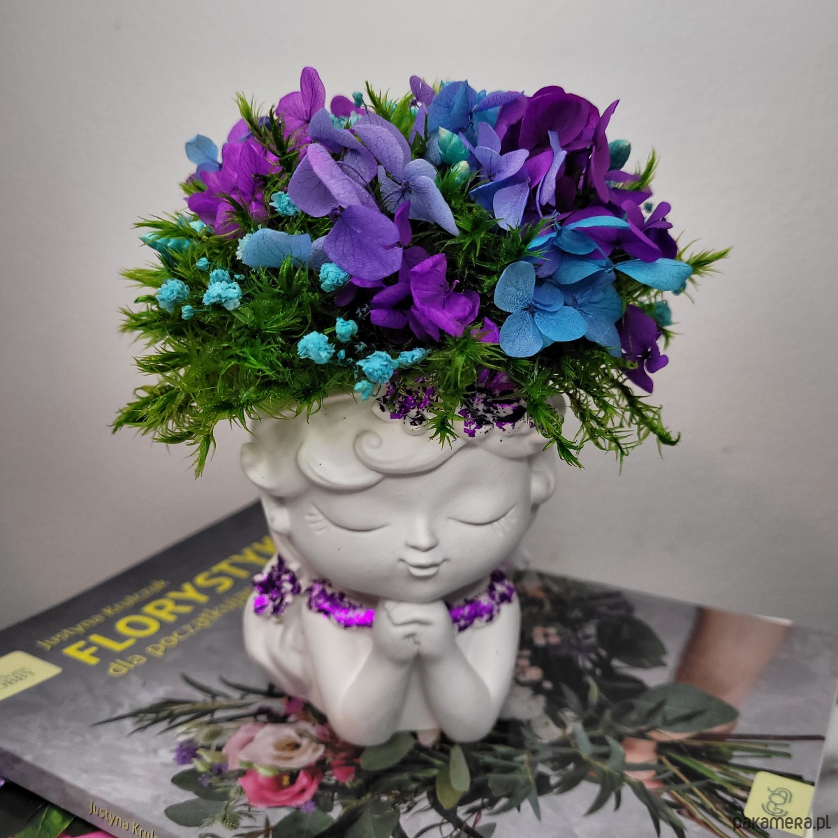 Dziewczynka w zamyślonej pozie jakby marzyła, a jej fryzura zamieniła się w bukiet ze stabilizowanego mchu i suszonych kwiatów — nie wymagają pielęgnacji i zachowują świeżość przez długie lata.
