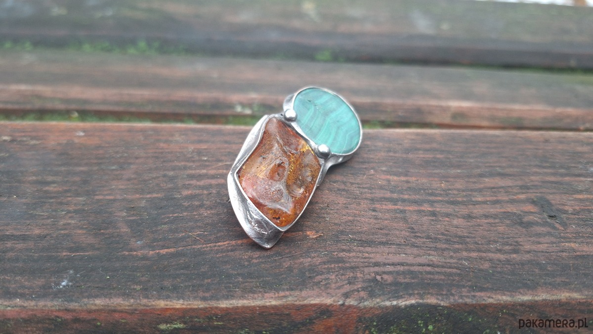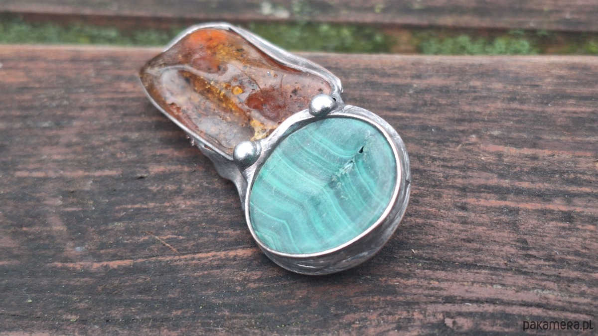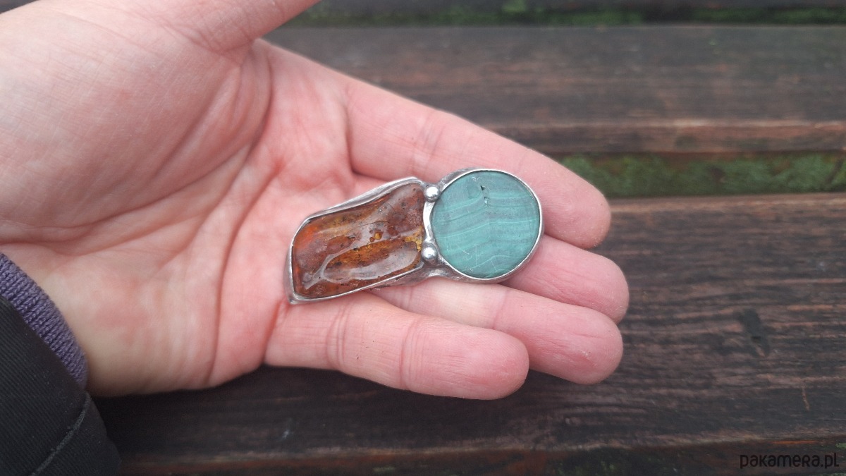 Broszka wykonana z miedzi, cyny, bursztynu i malachitu. Wymiary ok. 5.5 na 2 cm. Zapięcie metalowe.