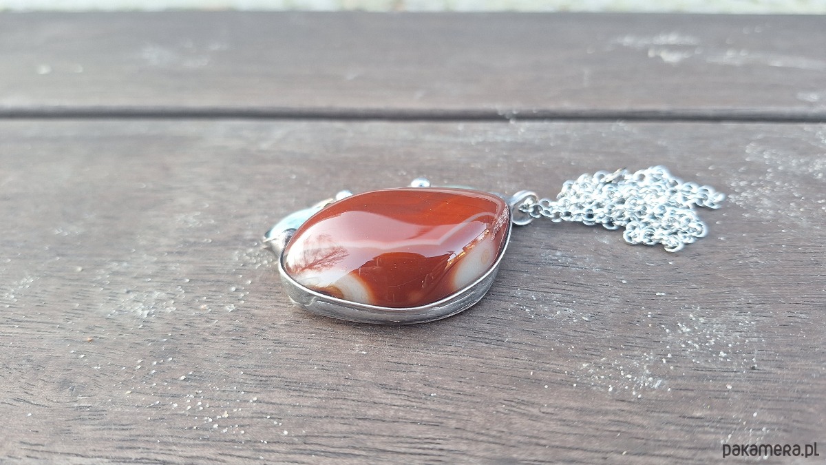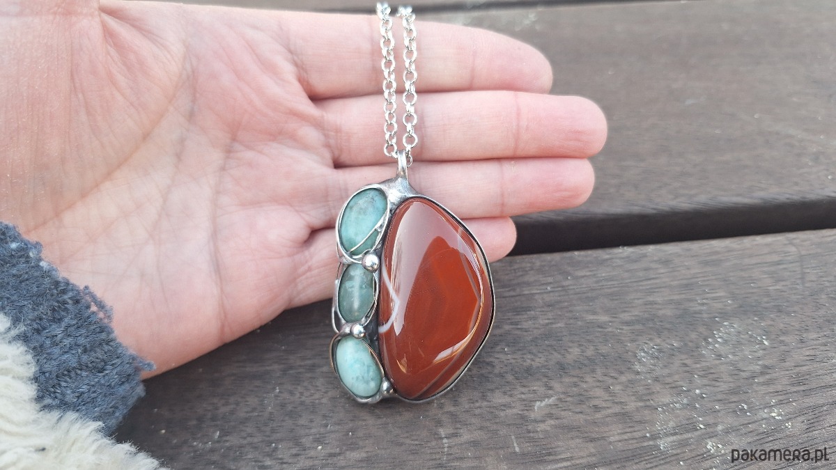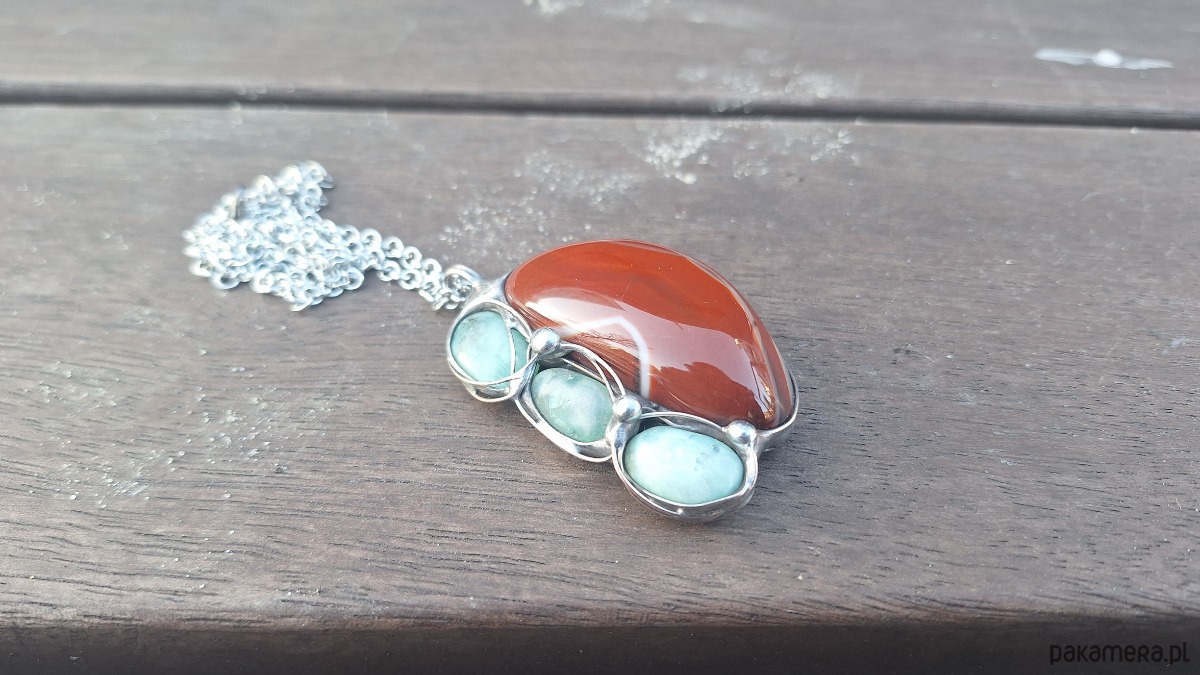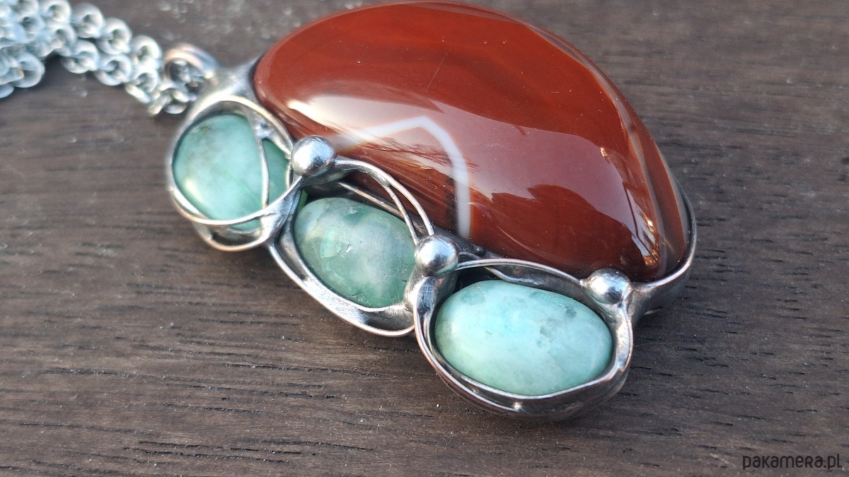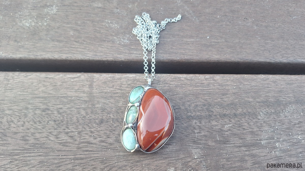 Wisiorek wykonany z miedzi, cyny, chryzoprazu i agatu. Wymiary ok. 5 na 4 cm. Zawieszony na łańcuszku o długości ok. 50 cm.