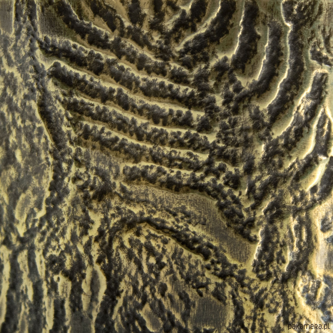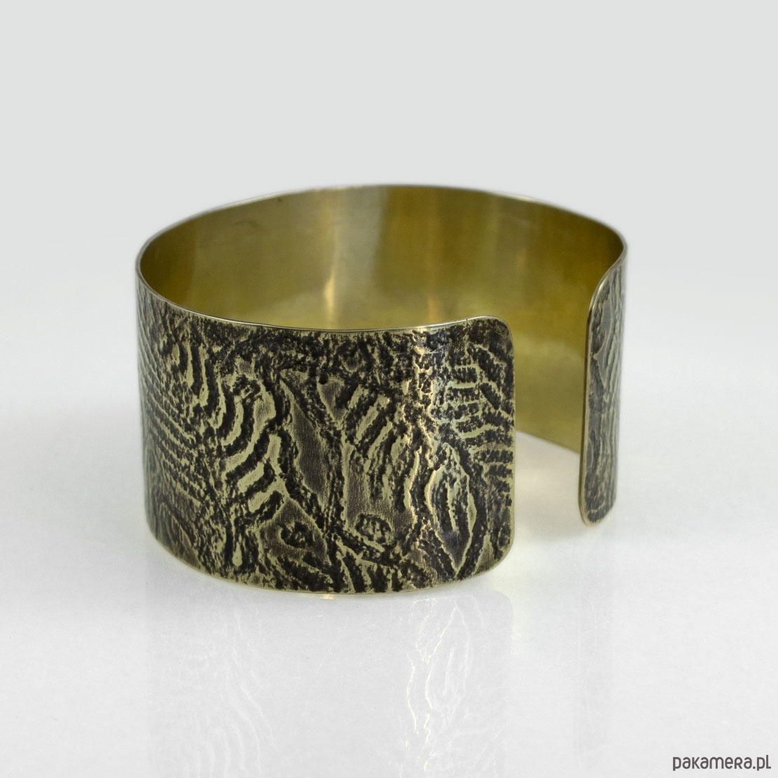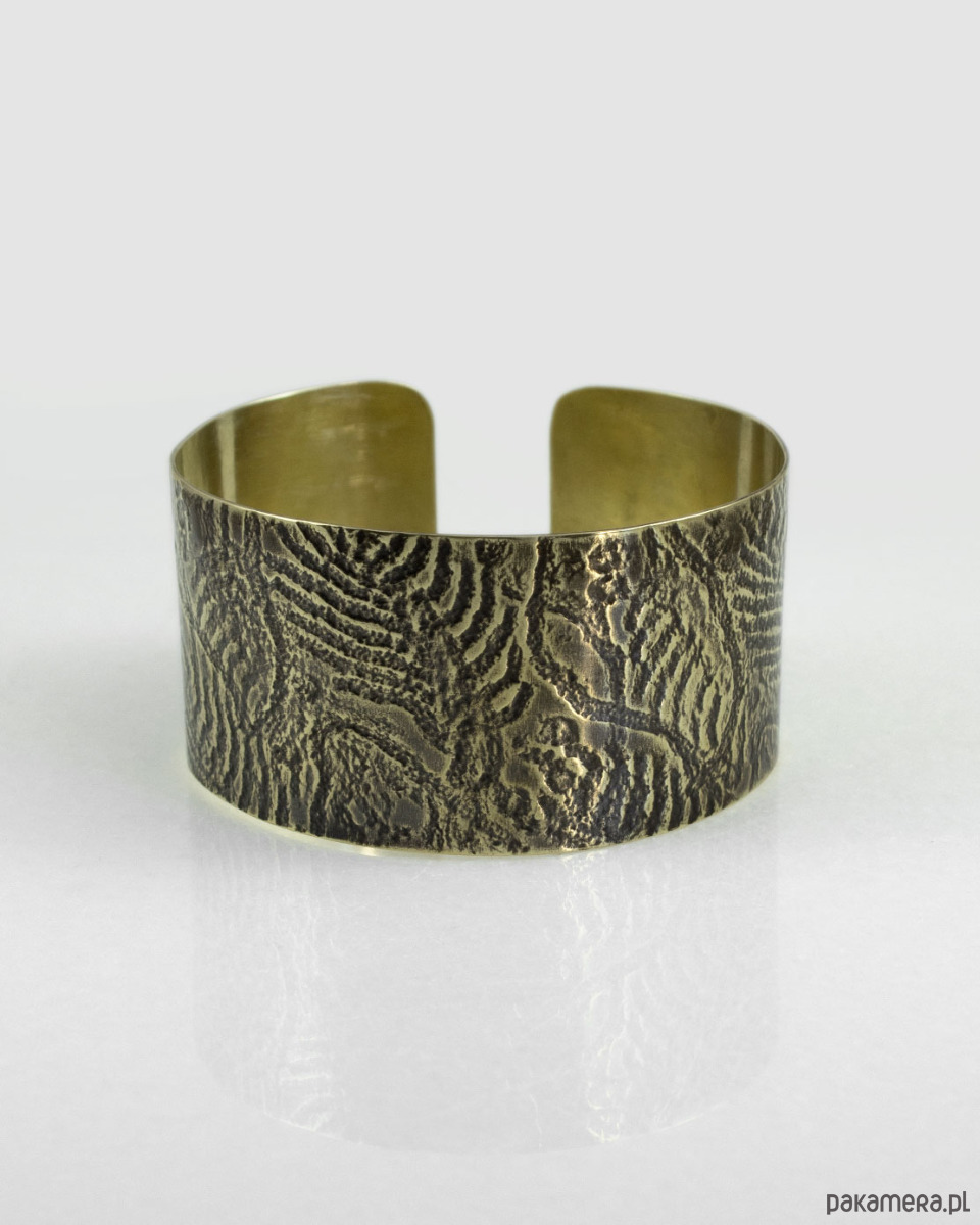 Wzór jest lekko podkreślony ciemną patyną uzyskaną w procesie oksydacji (bez użycia sztucznych barwników). Nieznaczne ciemnienie metalu na skutek użytkowania jest procesem naturalnym (należy unikać długotrwałego kontaktu bransolety z wilgocią).