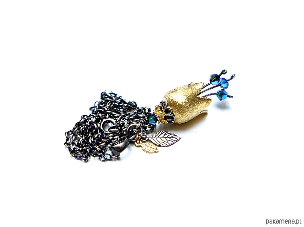 Naszyjnik wykonany ze srebra i srebra pokrytego 24k zlotem [pr. 925] w połączeniu z ręcznie formowanym kielichem kwiatów [18mm], listkami  oraz kryształkami Swarovski [4mm]. Srebro częściowo oksydowane i przetarte. Całkowita długość łańcuszka 55cm. Biżuteria ozdobnie zapakowana.