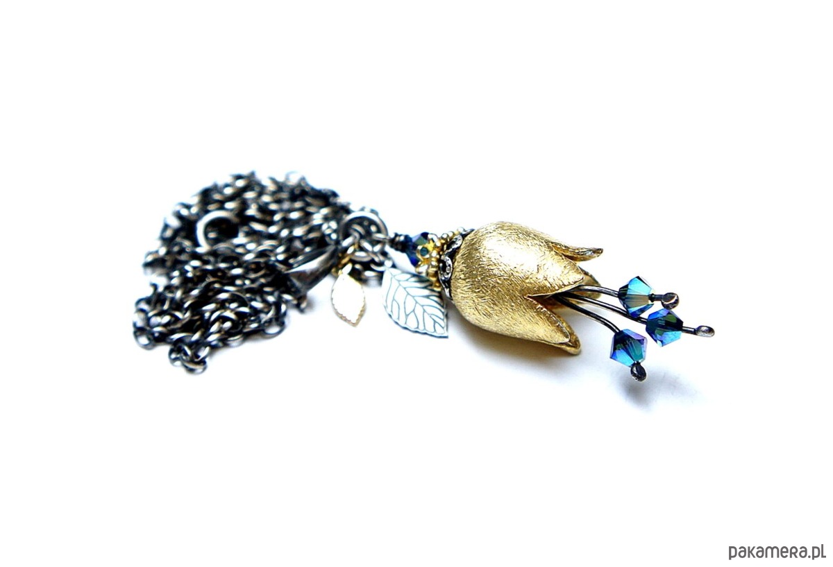 Naszyjnik wykonany ze srebra i srebra pokrytego 24k zlotem [pr. 925] w połączeniu z ręcznie formowanym kielichem kwiatów [18mm], listkami oraz kryształkami Swarovski [4mm]. Srebro częściowo oksydowane i przetarte. Całkowita długość łańcuszka 55cm. Biżuteria ozdobnie zapakowana.